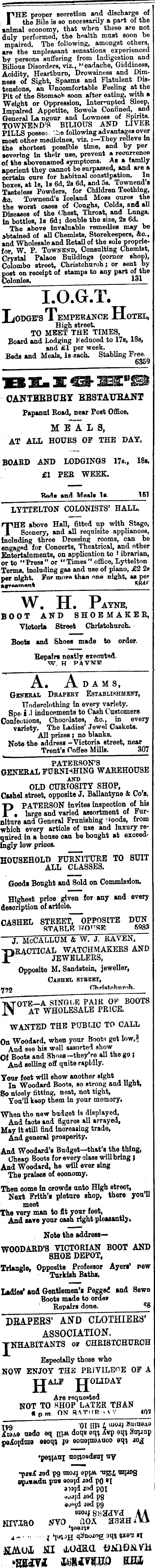 rHE proper secretion and discharge of the Bile is so necessarily a part of the animal economy, that when these are not duly performed, the health mnst soon be mpaired. The following, amongst others, are the unpleasant sensations experienced by persons suffering from Indigestion and Bilious Disorders, viz., headache, Giddiness, Acidity, Heartburn, Drowsiness and Dimness of Sight, Spasms and Flatulent Distensions, an Uncomfortable Feeling at the Pit of the Stomach soon after eating, with a Weight or Oppression, Interrupted Sleep, Impaired Appetite, Bowels Confined, and General La ngour and Lowness of Spirits. TOWNEND’S BILIOUS AND LIVER PILLS posse-. 'he following advantages over most other medicines, viz. :—They relieve In the shortest possible time, and by per severing In their use, prevent a recurrence of the abovenamed symptoms. As a family aperient they cannot be surpassed, and are a certain cure for habitual constipation. In boxes, at Is, Is 6d, 2s 6d, and sa, Townend s Tasteless Powders, for Children Teething, &0. Townend’s Iceland Moss cures the the worst cases of Coughs, Colds, and all Diseases of the Chest, Throat, and Lungs. In bottles, Is 6d; double the size, 2s 6d. The above Invaluable remedies may be attained of all Chemists, Storekeepers, &0., and Wholesale and Retail of the sole proprietor, W. P. ToWNBND, Consulting Chemist, Crystal Palace Buildings (corner shop), Colombo street, Christchurch; or sent by post on receipt of stamps to any part of the Colonies. 131 i.o.gTt. TiODGE’3 TTEMPERANCE HoTEL, High street. TO MEET THE TIMES, Board and Lodging f educed to 17s, 18s, and £1 per week. Beds and Meals, Is each. Stabling Free. OANTBBBUBT BBBTAUBANT Papanni Road, near Post Office, M E A L 3, AT ALL HOURS OF THE DAY. BOARD AND LODGINGS 175., 18s, £1 PER WEEK. Beds and Meals Is. IKI LYTTELTON COLONISTS’ HALL. rHE above Hall, fitted up with Stage, Scenery, and all requisite appliances, minding three Dressing rooms, can be ngaged for Concerts, Theatrical, and other Intertalnmenta, on application to > ibrarian, r to "Press” or "Times ’’ office, Lyttelton 'erms. Including gas and use of piano, £2 2s er night. For more than one night, as pet prAnmAnt W, H. Payne, BOOT AND SHOEMAKER, Victoria Street Christchurch. Boots and Shoes made to order. Repairs neatly executed W. H PAVNUI A* Adams, General Drapery Establishment, Underclothing In every variety. Spe. i .1 inducements to Cash Customers Confections, Chocolates, &c., in every variety. The Ladies’ Jewel Caskets. All prizes ; no blanks. Note the address -Victoria street, near Trent’s Coffee Mills. 307 PATERSON’S GENERAL FURNISHING WAREHOUSE AND OLD CURIOSITY SHOP, Cashel street, opposite J. Ballantyne & Go’s. P PATERSON Invites inspection of his « large and varied assortment of Furniture and General Frunishing ? foods, from which every article of use and luxury required in a bouse can be bought at exceedingly low prices. HOUSEHOLD FURNITURE TO SUIT ALL CLASSES. Goods Bought and Sold on Commission. Highest price given for any and every description of article. STREET, OPPOSITE DUN STABLE UO ri SE 5983 PRACTICAL WATCHMAKERS AND JEWELLERS, Opposite M. Sandstein, jeweller, Cashel street, nbrldtchimih. tote-a single pair of BOOTS \ at wholesale price. wanted the public to call Woodard, when your Boot* get low, R Smd see his well assorted show Boots and Shoes -they’re all the go J ind selling off quite rapidly. mr feet will show another sight in Woodard Boots, so strong and light, nicely fitting, neat, not tight, STon’U keep them In your memory. tan the new budget Is displayed, ind facts aud figures all arrayed, >y It still find Increasing trade, iknd general prosperity. A Woodard’s Budget—that’s the thing, Jheap Boots for every olass will bring ; id Woodard, he will ever sing Che praises of economy. en come in crowds unto High street, Next Frith’s picture shop, there you’U meet e very man to fit your feet, and save your cash right pleasantly. Note the address— OODARD’S VICTORIAN BOOT AND SHOE DEPOT, [angle, Opposite Professor Ayers’ new Turkish Baths, dies’ and Gentlemen’s Pegged and Sewn Boots made to order Repairs done. **B BAPEBS’ AND CLOTHIEES’ ASSOCIATION. THABITANTS 01 CHRISTCHURCH Especially those who W ENJOY THE PRIVILEGE OF A JJALF JjIJOHDAY Are requested NOT TO SHOP LATER THAN «pm ON qVIMR MV 40V 01 [ID L LUOJ I JltoooA o o nedo oq doqs oqq, A«p oq') Bu)jnp qdtao esoqt; jo eoaepiOAaoo oq') JOjj noDoedsuj try <p«A aed pg raojj eppn '«)?,£ mpiog spau&dn pu« aoojd aod pQ 8 I jad poi *j<qd iod pg «o«)d fed pg SbSfcU/d ,4/1 QOA H3HH iWi xao nvo iioa swan I qhnoiogr aq!) pen aj iUk L NI rhOdaa ONION VTi mxi mm
