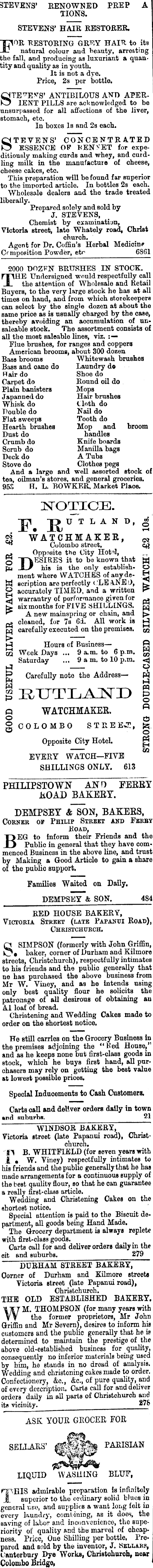 STEVENS’ RENOWNED PREP A TIONS. STEVENS’ HAIR RESTORER. For RESTORING GREY HAIR to its natural colour and beauty, arresting the fall, and producing as luxuriant a quantity and quality as in youth. It is not a dye. Price, 2s per bottle. STEVENS’ ANTIBILOUS AND APERIENT PILLS are acknowledged to be unsurpassed for all affections of the liver, stomach, etc. In boxes Is and 2s each. STEVENS’ CONCENTRATED ESSENCE OP REN C ET for expeditiously making curds and whey, and curdling milk in the manufacture of cheese, cheese cakes, etc. This preparation will be found far superior to the imported article. In bottles 2s each. Wholesale dealers and the trade treated liberally. Prepared solely and sold by J. STEVENS, Chemist by examination, Victoria street, late Whately road, Christ church. Agent for Dr. Coffin's Herbal Medicine Composition Powder, etc 6861 2000 DOZFN BRUSHES IN STOCK. THE Undersigned would respectfully call the attention of Wholesale and Retail Buyers, to the very large stock he has at all times on hand, and from which storekeepers can select by the single dozen at about the same price as is usually charged by the case, thereby avoiding an accumulation of unsaleable stock. The assortment consists of all the most saleable lines, viz. : Flue brushes, for ranges and coppers American brooms, about 300 dozen Bass brooms Bass and cane do H air do Carpet do Plain banisters Japanned do Whisk do Double do Flat sweeps Hearth brushes Dust do Crumb do Scrub do Deck do Stove do Whitewash brushes Laundry do Shoe do Round oil do Mops Hair brushes Cloth do Nail do Tooth do Mop and broom handles Knife boards Manilla bags A Tubs Clothes pegs And a large and well assorted stock of tea, oilman’s stores, and general groceries. 35f. H. L. BOWKER, Market Place, IsTOTICE. F. B, UPLAND, WATCHMAKER, Colombo street, Opposite the City Hotol, DESIRES it to be known that his is the only establishment where WATCHES of any description are perfectly t LE \NE l), accurately TIMED, and a written warrantry of performance given for six months for FIVE SHILLINGS. A new mainspring or chain, and cleaned, for 7s 6i. All work is carefully executed on the premises. Hours of Business — Week Days ... 9 a.m. to 6 p.m. Saturday ... 9am.to 10 p.m. Carefully note the Address — RUTTjAJSTD C-3 Pd O pw w o H < * Ph pq > Hi i—i m Hi H> W m P P o g COLOMBO WATCHMAKER. STREET, Opposite City Hotel. <7? c rt W o H <3 P 3 W > P HI CO p W CO <1 o W P m P p Cj fcO Ph H CO EVERY WATCH—FIVE SHILLINGS ONLY. 613 PHILIPSTOWN AN O FERRY ROAD bakery. DEMPSEY & SON, BAKERS, Corner of Philip Street and Ferry Road, BEG to inform their Friends and the Public in general that they have commenced Business in the above line, and trust by Making a Good Article to gain a share of the public support. Families Waited on Daily. DEMPSEY & SON. 484 RED HOUSE BAKERY, Victoria Street (late Papanui Road), Christchurch. O SIMPSON (formerly with John Griffin, ij, baker, corner of Durham and Kilmore streets, Christchurch), respectfully intimates to his friends and the public generally that tie has purchased the above business from Mr W. Viney, and as he Intends using only best quality flour he solicits the patronage of all desirous of obtaining an A 1 loaf of bread. Christening and Wedding Cakes made to order on the shortest notice. He still carries on the Grocery Business in the premises adjoining the “Bed House,” and as he keeps none but first-class goods in stock, which he buys first hand, all purchasers may rely on getting the best value at lowest possible prices. Special Inducements to Cash Customers. Carts call and deliver orders dally in town and suburbs. 21 WINDSOR BAKERY, “ Victoria street (late Papanui road), Christchurch. (n B. WHITFIELD (for seven years with | • W. Viney) respectfully intimates to his friends and the public generally that he has made arrangements for a continuous supply of the best qaulity flour, so that he can guarantee a really first-class article. Wedding and Christening Oakes on the shortest notice. Special attention is paid to the Biscuit department, all goods being Hand Made. The Grocery department is always replete with first-class goods. Carts call for and deliver orders daily in the oit and suburbs. 279 DURHAM STREET BAKERY, Corner of Durham and Kilmore streets Victoria street (late Papanui road), Christchurch. THE OLD ESTABLISHED BAKERY. WM. THOMPSON (for many years with the former proprietors, Mr John Griffin and Mr Severn), desires to inform his customers and the public generally that he is determined to maintain the prestige of the above old-established business for quality, consequently no inferior materials being used by him, ho stands in no dread of analysis. Wedding and christening cakes made to order. Confectionery, &c., &c., of pure quality, and of every description. Carts call for and deliver orders daily in all parts of Christchurch and its vicinity. ASK YOUR GROCER FOR SELLARS’ PARISIAN LIQUID WASHING BLUF, SIS admirable preparation is infinitely superior to the ordinary solid blues in ral use, and supplies a want long felt in y laundry, combining, as it does, the ig of labor and inconvenience, the supety of quality and the marvel of cheapPrice, One Shilling per bottle. Pred and said by the inventor, J. Kkllaks, ierbmy Dye Works, Christchurch, near mho Bridge,