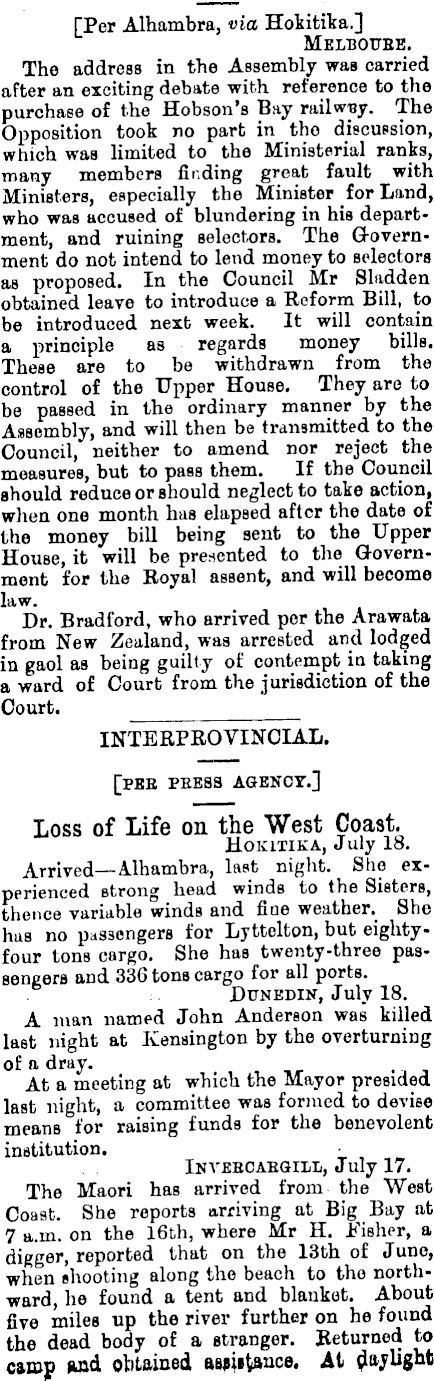 [Per Alhambra, via Hokitika.] Melbottbe. The address in the Assembly was carried after an exciting debate with reference to the purchase of the Hobson's Bay railway. The Opposition took no part in tho discussion, which was limited to the Ministerial ranks, many members finding great fault with Ministers, especially the Minister for Land, who was accused of blundering in his department, and ruining selectors. The Government do not intend to lend money to selectors as proposed. In the Council Mr Sladden obtained leave to introduce a Reform Bill, to be introduced next week. It will contain a principle as regards money bills. These are to be withdrawn from the control of the Upper House. They are to be passed in the ordinary manner by the Assembly, and will then be transmitted to the Council, neither to amend nor reject the measures, but to pass them. If the Council should reduce or should neglect to take action, when one month has elapsed after the date of the money bill being sent to the Upper House, it will be presented to the Government for the Royal assent, and will become law. Dr. Bradford, who arrived per the Arawata from New Zealand, was arrested and lodged in gaol as being guilty of contempt in taking a ward of Court from the jurisdiction of the Court. INTERPROVINCIAL. [PEE PRESS AGEKOr.] Loss of Life on the West Coast. HOKITIKA, July 18. Arrived—Alhambra, laßt ni g ht - Sn ? experienced strong head winds to the Sisters, thence variable winds and flue weather. She has no passengers for Lyttelton, but eightyfour tons cargo. She has twenty-three passengers and 336 tons cargo for all ports. Dunedin, July 18. A man named John Anderson was killed last night at Kensington by the overturning of a dray. At a meeting at which the Mayor presided last night, a committee was formed to devise means for raising funds for the benevolent institution. Invebcabgill, July 17. The Maori has arrived from the West Coast. She reports arriving at Big Bay at 7 a.m. on the 16th, where Mr H. Jb'isher, a digger, reported that on the 13th of June, when shooting along the beach to the northward, he found a tent and blanket. About five miles up the river further on he found the dead body of a stranger. Returned to camp wad obtained asjiitftnce. At daylight