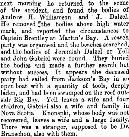 next morning he returned to the scene of the accident, and found the bodies of Andrew H. Williamson and J. Dalzel. He removed *'the bodies above high water mark, and reported the circumstances to Captain Brentley at Martin's Bay. A nearch party was organised and the benches searched, and the bodies of Jeremiah Dalzel or Yell and John Q-abriel were found. They buried the bodies and made a further search but without success. It appears the deceased party had sailed from Jackson's Bay in an open boat with a quantity of tools, deeply laden, and had been swamped on the reef outside Big Buy. Yell leaves a wife and lour children, Gabriel also a wife and family in Nova Scotia. Knonspki, whose body was not recovered, leaves a wife and a large family. There was a stranger, supposed to be Dr. Branschon, also with them.