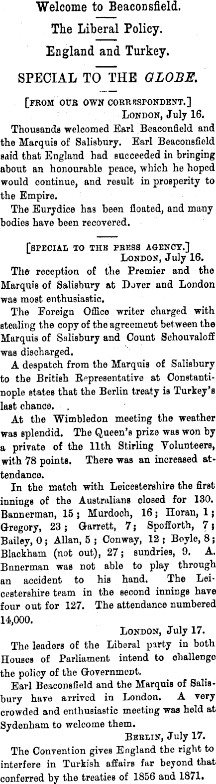 Welcome to Beacon sfield. The Liberal Policy. England and Turkey. SPECIAL TO THE GLOBE. [FROM OtTB OWN CORKRSPONDENT.] London, July 16. Thousands welcomed Earl Beaconfield and the Marquis of Salisbury. Earl Beaconsfield said that England had succeeded in bringing about an honourable peace, which he hoped would continue, and result in prosperity to the Empire. The Eurydice has been floated, and many bodies have been recovered. [special to the peess agency.] London, July 16. The reception of the Premier and the Marquis of Salisbury at Dover and London was most enthusiastic. The Foreign Office writer charged with stealing the copy of the agreement between the Marquis of Salisbury and Count Schouvaloff was discharged. A despatch from the Marquis of Salisbury to the British Bepresentative at Constantinople states that the Berlin treaty is Turkey's last chance. . At the Wimbledon meeting the weather was splendid. The Queen's prize was won by a private of the 11th Stirling Volunteers, with 78 points. There was an increased attendance. In the match with Leicestershire the first innings of the Australians closed for 130. Bannerman, 15 ; Murdoch, 16 ; Horan, 1; Gregory, 23; G-arrett, 7; Spofforth, 7; Bailey, 0 ; Allan, 5 ; Conway, 12 ; Boyle, 8 ; Blackham (not out), 27; sundries, 9. A. Bnnerman was not able to play through an accident to his hand. The Leicestershire team in the second innings have four out for 127. The attendance numbered 14,000. London, July 17. The leaders of the Liberal party in both Houses of Parliament intend to challenge the policy of the G-overnmeDt. Earl Beaconsfield and the Marquis of Salisbury have arrived in London. A very crowded and enthusiastic meeting was held at Sydenham to welcome them. Beelin, July 17. The Convention gives England the right to interfere in Turkish affairs far bejond that conferred by the treaties of 1856 and 1871.