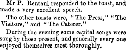 Mr P, Rentaul responded to the toast, and made a very excellent speech. The other toasts were, “The Press,” “The Visitors,” and “The Caterer.” During the evening some capital songs were sang by those present, and generally every one enjoyed themselves most thoroughly,