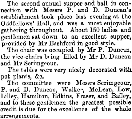 The second annual supper and ball in connection with Messrs P. and D. Duncan’s establishment took place last evening at the Oddfellows’ Hall, and was a most enjoyable gathering throughout. About 150 ladies and gentlemen sat down to an excellent supper, provided by Mr Bashford in good style. The chair was occupied by Mr P. Duncan, the vice-chairs bring filled by Mr D. Duncan and Mr Scrimgeour. The tables were very nicely decorated with pot plants, &c. The committee were Messrs Scrimgeour, P. and D. Duncan, Walker, McLean, Low, Lilley, Hamilton, Edkins, Fraser, and Bailey, and to these gentlemen the greatest possible credit is due for the excellence of the whole arrangements.