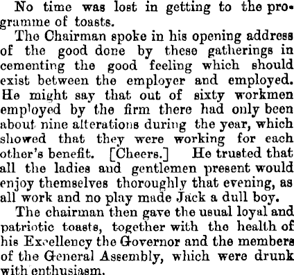 No time was lost in getting to the programme of toasts. The Chairman spoke in his opening address of the good done by these gatherings in cementing the good feeling which should exist between the employer and employed. He might say that out of sixty workmen employed by the firm there had only been about nine alterations during the year, which showed that they were working for each other 's benefit. [Cheers.] He trusted that all the ladies and gentlemen present would enjoy themselves thoroughly that evening, as all work and no play made jack a dull boy. The chairman then gave the usual loyal and. patriotic toasts, together with the health of his Excellency the Governor and the members of the General Assembly, which were drunk with enthusiasm.