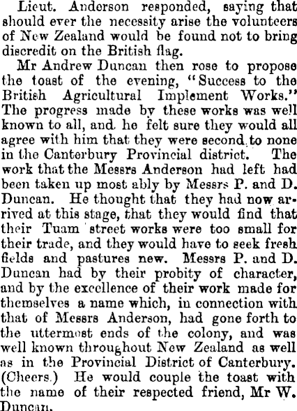 Lieut. Anderson responded, saying that should ever the necessity arise the volunteers of New Zealand would be found not to bring discredit on the British flag. Mr Andrew Duncan then rose to propose the toast of the evening, “Success to the British Agricultural Implement Works.” The progress made by these works was well known to all, and. he felt sure they would all agree with him that they were second to none in the Canterbury Provincial district. The work that the Messrs Anderson had left had been taken up most ably by Messrs P. and D. Duncan. Ho thought that they had now arrived at this stage, that they would find that their Tuam street works were too small for their trade, and they would have to seek fresh fields and pastures new. Messrs P. and D. Duncan had by their probity of character, and by the excellence of their work made for themselves a name which, in connection with that of Messrs Anderson, had gone forth to the uttermost ends of the colony, and was well known throughout New Zealand as well as in the Provincial District of Canterbury. (Cheers.) He would couple the toast with the name of their respected friend, Mr W. Duncan.