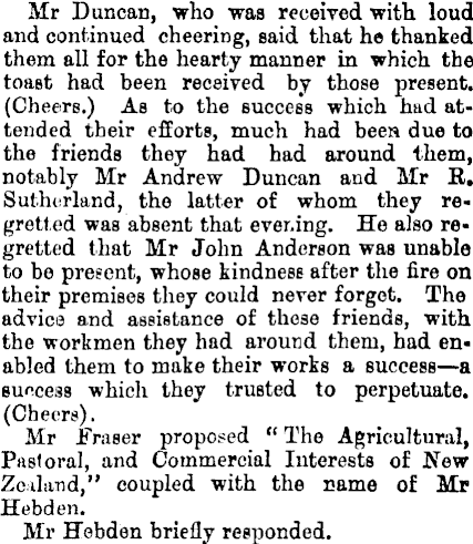 Mr Duncan, who was received with loud and continued cheering, said that he thanked them all for the hearty manner in which the toast had been received by those present. (Cheers.) As to the success which had attended their efforts, much had been due to the friends they had had around them, notably Mr Andrew Duncan and Mr R, Sutherland, the latter of whom they regretted was absent that evening. He also regretted that Mr John Anderson was unable to be present, whose kindness after the fire on their premises they could never forget. The advice and assistance of these friends, with the workmen they had around them, had enabled them to make their works a success—a success which they trusted to perpetuate. (Cheers). Mr Fraser proposed “ The Agricultural, Pastoral, and Commercial Interests of New Zealand,” coupled with the name of Mr Hebden. Mr Hebden briefly responded.
