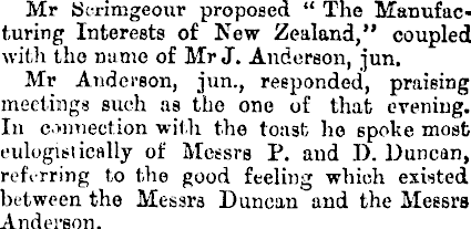 Mr Scrimgeour proposed “ The Manufacturing Interests of New Zealand,” coupled with the name of Mr J. Anderson, jun, Mr Anderson, jun., responded, praising meetings such as the one of that evening. In connection with the toast ho spoke most eulogist ically of Messrs P. and D. Duncan, referring to the good feeling which existed between the Messrs Duncan and the Messrs Anderson.