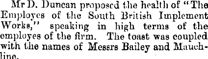 MrD. Duncan proposed the health of “The Employes of the South British Implement Works,” speaking in high terms of the employes of the firm. The (oast was coupled with the names of Messrs Bailey and Mauchline.