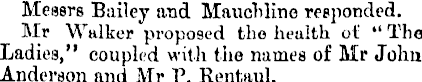 Messrs Bailey and Mauchline responded. Mr Walker proposed the health of “ The Ladies,” coupled with the names of Mr John Anderson and Air P. Rentaul.