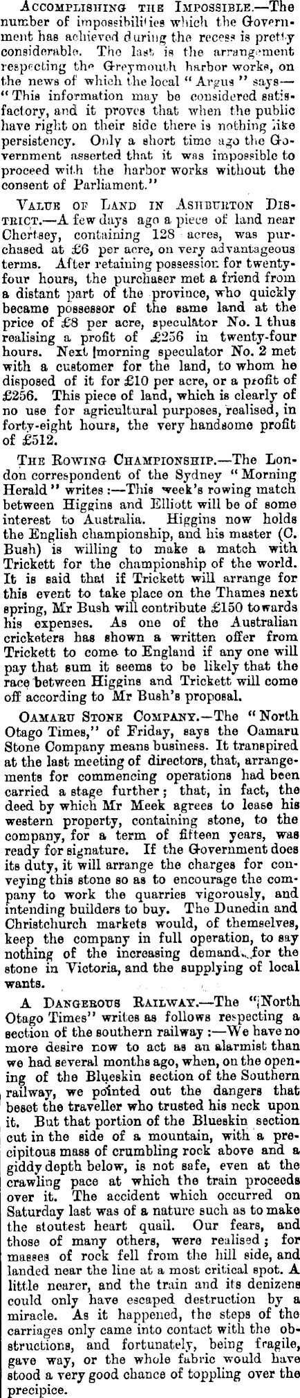 Accomplishing the Impossible.—The number of impossibilities which the Government has achieved during the recess is pretty considerable. The last is the arrangement respecting the Greymouth harbor works, on the news of which the local “ Argus ” says—- “ This information may bo considered satisfactory, and it proves that when the public have right on their side there is nothing like persistency. Only a short time ago the Government asserted that it was impossible to proceed wit h the harbor works without the consent of Parliament.” Yaltjr of Land in Ashburton District. —A few days ago a piece of land near Chertsey, containing 128 acres, was purchased at £6 per acre, on very advantageous terms. After retaining possession for twentyfour hours, the purchaser met a friend from a distant part of the province, who quickly became possessor of the same land at the price of £8 per acre, speculator No. 1 thus realising a, profit of £256 in twenty-four hours. Next (morning speculator No. 2 met with a customer for the land, to whom he disposed of it for £lO per acre, or a profit of £256, This piece of land, which is clearly of no use for agricultural purposes, realised, in fortv-eight hours, the very handsome profit of £512. The Rowing Championship.—The London correspondent of the Sydney “ Morning Herald” writes ;—Tins week’s rowing match between Higgins and Elliott will be of some interest to Australia. Higgins now holds the English championship, and his master (C. Bush) is willing to make a match with Trickett for the championship of the world. It is said that if Trickett will arrange for this event to take place on the Thames next spring, Mr Bush will contribute £l5O towards his expenses. As one of the Australian cricketers has shown a written offer from Trickett to come to England if any one will pay that sum it seems to be likely that the race between Higgins and Trickett will come off according to Mr Bush’s proposal. Oamahu Stoke Company.—The “ North Otago Times,” of Friday, says the Oamaru Stone Company means business. It transpired at the last meeting of directors, that, arrangements for commencing operations had been carried a stage further; that, in fact, the deed by which Mr Meek agrees to lease his western property, containing stone, to the company, for a term of fifteen years, was ready for signature. If the Government does its duty, it will arrange the charges for conveying this stone so as to encourage the company to work the quarries vigorously, and intending builders to buy. The Dunedin and Christchurch markets would, of themselves, keep the company in full operation, to say nothing of the increasing demand for the stone in Victoria, and the supplying of local wants. A Dangerous Railway.—The “'North Otago Times” writes as follows respecting a section of the southern railway : —We have no more desire now to act as an alarmist than we had several months ago, when, on the opening of the Blueskin section of the Southern railway, we pointed out the dangers that besot the traveller who trusted his neck upon it. But that portion of the Blueskin section cut in the side of a mountain, with a precipitous mass of crumbling rock above and a giddy depth below, is not safe, even at the crawling pace at which the train proceeds over it. The accident which occurred on Saturday last was of a nature such as to make the stoutest heart quail. Our fears, and those of many others, were realised; for masses of rock fell from the hill side, and landed near the line at a most critical spot. A little nearer, and the train and its denizens could only have escaped destruction by a miracle. As it happened, the steps of the carriages only came into contact with the obstructions, and fortunately, being fragile, gave way, or the whole fabric would have stood a very good chance of toppling over the precipice.