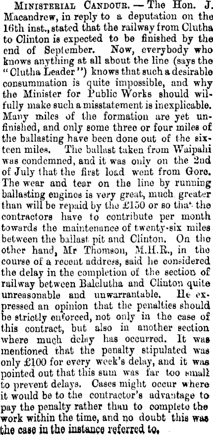 Ministekial Candoue. Tho Hon. J. Macandrcw, in reply to a deputation on tho 16th inst., stated that the railway from Clutha to Clinton is expected to be finished by the end of September. Now, everybody who knows anything at all about the line (says tho “ Clutha Leader ”) knows that such a desirable consummation is quite impossible, and why the Minister for Public Works should wilfully make such a misstatement is inexplicable. Many miles of the formation are yet unfinished, and only some three or four miles of the ballasting have been done out of the sixteen miles. The ballast taken from Waipahi was condemned, and it was only on the 2nd of July that the first load went from Gore. The wear and tear on the lino by running ballasting engines is very great, much greater than will be repaid by the £l5O or so tha* the contractors have to contribute per month towards the maintenance of twenty-six miles between the ballast pit and Clinton. On the other hand, Mr Thomson, M.H.K., in the course of a recent address, said he comidered the delay in the completion of the section of railway between Eaiclutba and Clinton quite unreasonable and uuwarrantable. He expressed an opinion that the penalties should bo strictly enforced, not only in tho case of this contract, but also in another section where much delay has occurred. It was mentioned that the penalty stipulated was only £IOO for every week’s delay, and it was pointed out that this sum was far too small lio prevent delays. Cases might occur w here it would be to tho contractor’s advantage to pay tho penalty rather than to complete the work within the time, and no doubt this was the case in the instance referred to.