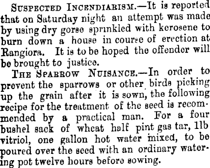 Suspected Incbndiaeisvi. —It is reported that on Saturday night an attempt was made by using dry gorso sprinkled with kerosene to burn down a house in course of erection at Rangiora. It is to be hoped the offender will be brought to justice. The Spaeeow Nuisance.—ln order to prevent the sparrows or other birds picking up the grain after it is sown, the following recipe for the treatment of the seed is recommended by a practical man. For a four bushel sack of wheat half pint gas tar, lib vitriol, one gallon hot water mixed, to be poured over the seed with an ordinary watering pot twelve hours before sowing.