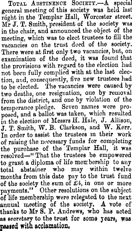 Total Abstinence Society. — A special general meeting of this society was held last night in the Templar Hall, Worcester street. Mr J. T. Smith, president of the society was in the chair, and announced the object of the meeting, which was to elect trustees to fill the vacancies on the trust deed of the society. There were at first only two vacancies, but, on examination of the deed, it was found that tho provisions with regard to the election had not been fully complied with at the last election, aiid, consequently, five new trustees had to be elected. The vacancies were caused by two deaths, one resignation, one by removal from the district, and one by violation of the temperance pledge. Seven names were proposed, and a ballot was taken, which resulted in the election of Messrs H. Hale, J. Allison, J, T. Smith, W. B. Clarkson, and W. Kerr. In order to assist tho trustees in their wmrk of raising the necessary funds for completing tho purchase of the Templar Hall, it was resolved —“ That the trustees be empowered to grant a diploma of life membership to any total abstainer who may within twelve months from this date pay to the trust fund of the society the sum of £4, in one or more payments.” Other resolutions on the subject of life membership were relegated to the next annual meeting of the society. A vote of thanks to Mr S. P. Andrews, who has acted as secretary to the trust for some years, was passed with acclamation.