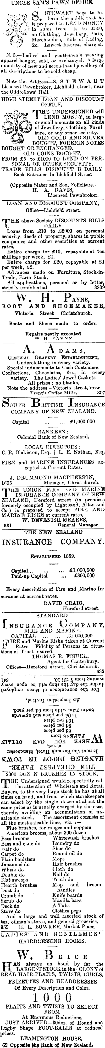 UNCLE SAM’S PAWN OFFICE. ,„. Q STEWART begs to In-.'-i’jy if form the public that ho S' s f.f 1° Bums from 1h to £SOO, on Clothing, Jewellery, Plato, /4 Merchandise, Billn of Lading, * &o. Lowent interest charged. N.ll,—Ladies’ and gentlemen's wearing apparel bought, sold, or exchanged. A largo quantity of new and secondhand jewellery of all d oMoiiptions to bo sold cheap. Note the Address—S. STEW ART Licensed Pawnbroker, Lichfield street, near the Oddfellows’ Hall. HIGH STREET LOAN AND DISCOUNT OFFICE. rnHE UNDERSIGNED will 1 LEND MONEY, in largo or small amounts on all kinds of Jewellery, Clothing, Furniture, or any other security. OLD GOLD AND SILVER BOUGHT, FOREIGN NOTES BOUGHT OR EXCHANGED. OLD COINS BOUGHT. FROM £5 to £IOOO TO LEND ON PERSONAL OR OTHER SECURITY. TRADE BILLS DISCOUNT D DAILY Back Entrance in Lichfield Street (Opposite Slater and Son, w oilcltors, H. A. DAVIS, Licensed Pawnbroker, LOAN and DISCOUNT COMPANY, Office —Lichficffi street, *npHE above Society DISCOUNTS BILLS DAILY Loans from £lO to £SOOO on personal security, deeds of property, shares in public companies and other securities at current rates. Entire charge for £lO, repayable at ten shillings per week, £l. Entire charge for £2O, repayable at £1 per week, £2. Advances made on Furniture, Stock-in Trade, Farm Stock. All applications, personal or by letter, strictly confidential 3309 VV . H , P AYNE, BOOT AND SHOEMAKER, Victoria Street Christchurch. Boots and Shoes made to order. Repairs neatly executed W TT r»/VVNT T A. Adams, General Drapery Establishment, Underclothing in every variety. Special inducements to Cash Customers Confections, Chocolates, &c., in every variety. The Ladies’ Jewel Caskets. All prizes ; no bianks. Note the address -Victoria street, near Trent’s Ooffee Mills. 307 South IBrititsh Insurance COMPANY OF NEW ZEALAND. Capital ... ... £1,000,000 BANKERS: Colonial Bank of New Zealand, LOCAL DIREC TORS : C. R. Blakiston, Esq. | L. E. Nathan, Esq. FIRE and MARINE INSURANCES accepted at Current Rates. J. DRUMMOND MACPHERSON, lfios Manager, Christchurch, raiHE UNION FiR t aD MARINE I INSURANCE COMP ANY OP NEW ZEALAND, Hereford street (in premises formerly occupied by Lightband, Allan and Co.) is prepared to accept FIRE ANL MARIN E RISKS at current rates. W. DEVENISH M FARES, 531 General Manager THE NEW ZEALAND INSURANCE COMPANY. Established 1859. Capital... ... ... £1,000,000 Paid-up Capital ... £300,000 Every description of Fire and Marino Insurance at current rates. DAVID CRAIG, Hereford street STANDARD Insurance Company. FIRE AND MARINE. CAPITAL ... ... £1,050,000. in IRE and M arine Risks taken at Current Rates. Fidelity of Persons in Situations of Trust insured, THOMAS R. FISHER. Agent for Canterbury. Offices—Hereford street, Christchurch. «83 IP9 ‘ 01 III? I moaj Aiuuoau k toao uodo eq pjAi clous oqs Zvp oqq Bupmp poifoiduio osoqs jo ooaojuoAaco oqi jo^[ •po!}{AUi nopoodsui uy ■pace? .19(1 po raojj appe. -nr7,i tnjaog yim ooojd xod po e[ paißjd Xjd poi euO[d aod pg ooojd aod po rao,q SiiadVJ MIVJAO NYO HOA HaHHjequoqouvjq ‘i&ijojq qSnoaog KAIOX m. XOdHCT BNIBMYB -ggjva:: xsaxygHO shx ■ 2000 D(>Zi N BRUSHES IN SI’OCK. THE Undersigned would respectfully cal the attention of Wholesale and Retail Buyers, to the very large stock he has at all times on hand, and from which storekeepers can select by the single dozen at about the same price as is usually charged by the case, thereby avoiding an accumulation of unsaleable stock. The assortment consists of all the most saleable lines, viz. : Flue brushes, for ranges and coppers American brooms, about 300 dozen Bass brooms Bass and cane do H air do Carpet do Plain banisters Japanned do Whisk do Double do Flat sweeps Hearth brushes Dust do Crumb do Scrub do Deck do Stove do And a large Whitewash brushes Laundry do Shoe do Round oil do Mops Hair brushes Cloth do Nail do Tooth do Mop and broom handles Knife boards Manilla bags A Tubs Clothes pegs and well assorted stock of tea, oilman’s stores, and general groceries. 953 H. L. BOWKER. Market Place, LADIES’ AND GENTLEMEN’ HAIRDRESSING ROOMS. W. Brigs HAS always on hand by far the LARGEST STOCK in the 1 OLONYof REAL HAIR-PLAITS, TWISTS, CURLS, FEIZETTES AND HEADDRESSES Of Every Description and Color. 10 0 0 PLAITS AND TWISTS TO SELECT FROM At Enormous Reductions. JUST ARRIVED—3Odoz. of Ronnd ana Rugby Shape FOOT-BALLS at reduced prices. LEAMINGTON HOUSE, 62 Opposite the Bank of Now Zealand.