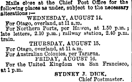 Mails close at the Chief Poat Office for the following places as under, subject to tho necessary alterations i WEDNESDAY, AUGUST 14. For Otago, overland, at 11 a.m. For Northern Ports, per Hawea, at 1.50 p.m. j late letters, 2.10 p.m.; railway station, 2.40 p.m. train. THURSDAY, AUGUST 15. For Otago, overland, at 11 a.m. For Australian Colonies, per Tararua. FRIDAY, AUGUST 16. For the United Kingdom via San Francisco, at 1 p.m. SYDNEY ,T. DICK, Chief Postmaster.