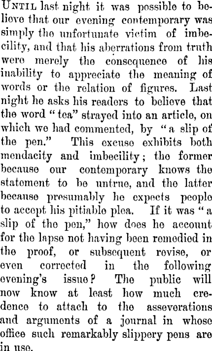 Until last night it w’as possible to believe that our evening contemporary was simply the unfortunate victim of imbecility, and that his aberrations from truth were merely the consequence of his inability to appreciate the meaning of words or the relation of figures. Last night ho asks bis readers to believe that the word “ tea” strayed into an article, on which wo had commented, by “a slip of the pen.” This excuse exhibits both mendacity and Imbecility; the former because our contemporary knows the statement to bo untrue, and the latter because presumably he expects people to accept his pitiable plea. If it was “ a slip of the pen,” how does ho account for the lapse not having been remedied in the proof, or subsequent revise, or even corrected in the following evening’s issue ? The public will now know at least how much credence to attach to the asseverations and arguments of a journal in whoso office such remarkably slippery pons are in use.