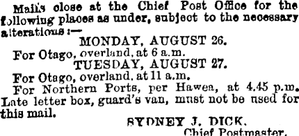 MaiKs close at the Chief Post OfSoe for the {allowing plaoee aa under, sub]eot to the necessary alteratiouß : MONDAY, AUGUST 26. Tor Ota*o. overland, at 6 a.m. TUESDAY, AUGUST 27. For Otago, overland, at 11 a.m. For Northern Ports, per Hawea, at 4.45 p.m. Late letter boi, guard's van, mnst not be used for this mail, 1 SYDNEY J, DTCK. rvhiof Postmaster.