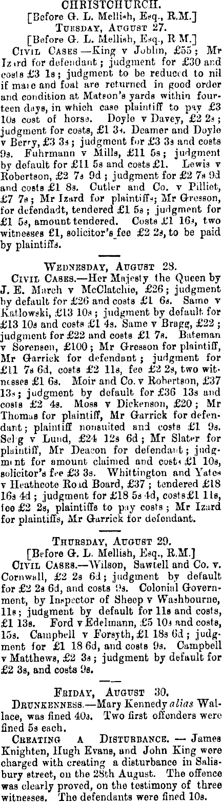 CHRISTCHURCH. [Before G. L, Melli*h, Esq., R.M.] Tuesday, August 27. [Before G-. L. Mellish, -Esq., R M.] Civil Cases —King v Jublm, £55 ; Mr Iz,rd for defendant; judgment for £3O and costs £3 Is; judgment to be reduced to nil if mate and foal are returned in good order and condition at Matson’s yards within fourteen days, in which case plaintiff to pay £3 10s cost of horsa. Doyle v Davey, £3 2s; judgment for costs, £1 3s. Deamer and Doyle v Berry, £3 3s; judgment for £3 3s and costs Os. Fuhrmann v Mills, £ll ss; judgment by default for £LI 5s and costs £l. Lewis v Robertson, £2 7s 9d ; judgment for £2 7s Od and costs £1 Bs. Cutler and Co. v Pilliet, £7 7s; Mr Izard for plaintiffs; Mr Grosson, for defendadt, tendered £1 5s ; judgment for £1 ss, amount tendered. Costs £1 16 s, two witnesses £l, solicitor’s fee £2 2s, to be paid by plaintiffs. Wednesday, August 28. Civil Cases. —Her Majesty the Queen by J. E. March v McClatchie, £26; judgment by default for £26 and costs £L 6s. Same v Katlowski, £l3 10s ; judgment by default for £l3 10s and costs £1 4s. Same v Bragg, £22 ; judgment for £22 and costs £1 7s. Bateman v Sorensen, £100; Mr Gresson for plaintiff, Mr Garrick for defendant ; judgment for £ll 7s 6d, costs £2 lls, fee £2 2s, two witnesses £1 6s. Moir and Co. v Robertson, £37 13s; judgment by default for £36 13s and costs £2 4s. Moss v Dickenson, £2O; Mr Thomas for plaintiff, Mr Garrick for defendant; plaintiff nonsuited and costs £1 os. Sel g v Lund, £24 12s 6d ; Mr Slater for plaintiff, Mr Deacon for defendant; judgmmt for amount claimed and costs £1 10s, solicitor’s fee £3 3s. Whittington and Yates v lleathcote Roid Board, £37 ; tendered £lB 16s Id ; judgment for £lB 5s Id, costs£l He, too £2 2s, plaintiffs to pay costs; Mr Izard for plaintiffs, Mr Garrick for defendant. Thursday, August 29. [Before G. L. Mellish, Esq., R.M.] Civil Cases. —Wilson, Sawtell and Co. v. Cornwall, £2 2a 6i; judgment by default for £2 2s 6d, and costs os. Colonial Government, by Inspector of Sheep v Washbourne, lls; judgment by default for lls and costs, £1 13s. Ford vEdelmann, £5 10s and costs, 15s. Campbell v Forsyth, £1 18s 6d ; judgment for £1 18 6d, and costs Os. Campbell v Matthews, £2 3s ; judgment by default for £2 3s, and costa os. Friday, August 30. Drunkenness.— Mary Kennedy alias Wallace, was fined 40s. Two first offenders were fined 5s each. Creating a Disturbance. James Knighten, Hugh Evans, and John King wore charged with creating a disturbance in Salisbury street, on the 28th August. The offence was clearly proved, on the testimony of three witnesses. The defendants were fined 10s.