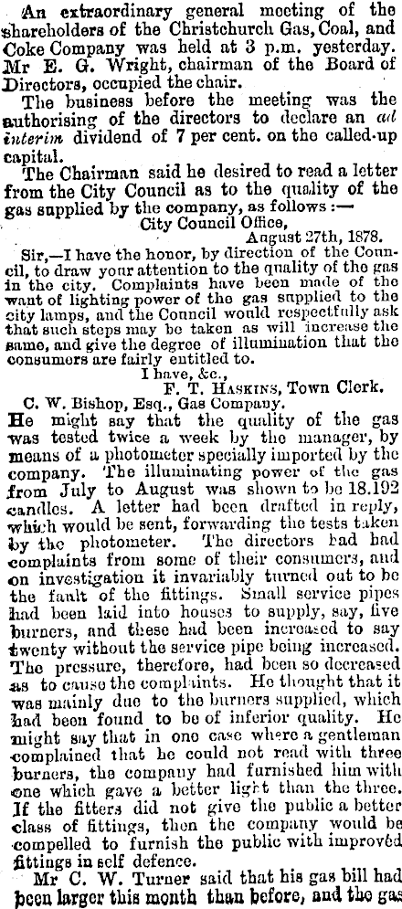 An extraordinary general meeting of the shareholders of the Christchurch Gas, Coal, and Coke Company was held at 3 p.m. yesterday. Mr B. G. Wright, chairman of the Board of jjiroctora, occupied the chair. The business before the meeting was the authorising of the directors to declare an a<l interim dividend of 7 per cent, on the called-up capital. The Chairman said he desired to read a letter from the City Council as to the quality of the eras supplied by the company, as follows : City Council Office, August :27th, 1878. Sir,—l have the honor, by direction of the Council, to draw yonr attention to the quality of tho pas in tho city. Complaints have been made of the want of lighting power of tho gas Supplied to tho city lamps, and the Conncil would respectfully ask that such steps may bo taken as will increase the same, and give the degree of illumination that the conaumors are fairly entitled to. I have, kc, P. T. H ask ins, Town Clerk. C. "W. Bishop, Esq., Gas Company. He might say that the quality of the gas ■was tested twice a week by the manager, by means of a photometer specially imported by the company. The illuminating power of the gas .from July to August was shown to be 18.192 candles. A letter had been dratted in reply, •which would be sent, forwarding the tests taken by the photometer. The directors bad had complaints from some of their consumers, and on investigation it invariably turned out to be the fault of the fittings. .Small service pipes had been laid into houses to supply, say, live burners, and these had becu increased to say twenty without tho service pipe being increased. The pressure, therefore, had been so decreased 4iß to cause the complaints. He thought that it was mainly duo to tho burners supplied, which had been found to bo of inferior quality. He might say that in ono case where a gentleman complained that he conld not road with three burners, tho company had furnished him with one which gave a better light than the three. If the fitters did not give tho public a better class of fittings, then the company would be compelled to furnish tho public with improv6d fittings in eclf defence. Mr C. W. Turner said that his gas bill had Jiecu larger this month than before, and the. gas