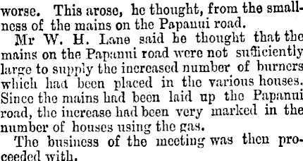 worse. This arose, he thought, from the smallness of the mains on the Papanui road. Mr W. H. Lane said he thought that the mains on the Papanui road were not sufficiently large to supply the increased number of burners which had been placed in the various houses. Since the mains had been laid up the Papanui road, the increase had been very marked in the number of houses using the pas. The business of the meeting was then proceeded with.