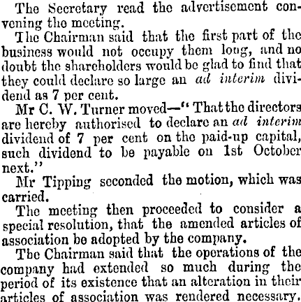 The Secretary read the advertisement convening the meeting. The Chairman said that the first part of the business would not occupy them long, and no doubt the shareholders would be glad to find that they could declare so largo an ad interim dividend as 7 per cent. Mr C. W. Turner moved—" That the directors are hereby authorised to declare an ad interim dividend of 7 per cent on the paid-up capital, such dividend to be payable on Ist October next." Mr Tipping seconded the motion, which wa3 carried. The meeting then proceeded to consider a special resolution, that the amended articles of association be adopted by the company. Tbc Chairman said that the operations of the company had extended so much during the period of its existence that an alteration in their articles of association was rendered necessary.