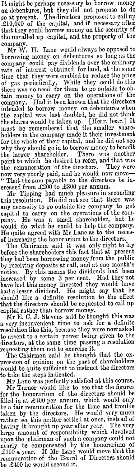It might be perhaps necessary to borrow money on debentures, but they did not propose to do so at present. The directors proposed to call up ■£lo,ooo of the capital, and if necessary after that they could borrow money on the security of the uncalled up capital, and the property of the company. Mr W. H. Lane would always bo opposed to borrowing money on debentures so long as the company could pay dividends over the ordinary rate of interest obtained for laud, at the same time that they were enabled to reduce the price of gas periodically. While they could do this there was no need for them to go outside to obtain money to carry on the operations of the company. Had it been known that the directors intended to borrow money on debentures when the capital was last doubled, he did not think the shares would be taken up. [Hear, hear.] It must be remembered that the smaller shareholders in the company made it their investment for the whole of their capital, and he did not see why they should go in to borrow money to benefit the larger shareholder. There was another point to which he desired to refer, and that was the remuneration of the directors. They were now very poorly paid, and he would now move—- " That the sum payable to the directors be increased from ,£2OO to £3OO per annum. Mr Tipping had much pleasure in seconding this resolution. He did not see that there was any necessity to go outside the company to get capital to carry on the operations of the company. He was a small shareholder, but he would do what he could to help the company. He quite agreed with Mr Lane as to the necesof increasing the honorarium to the directors. The Chairman said it was only right to lay before the shareholders this fact that at present they had been borrowing money from the public by receiving deposits at call, and at one month's notice. By this means the dividends had been increased by some 3 per cent. Had they not have had this money invested they would have had a lesser dividond. He might say that he should like a definite resolution to the effect that the directors should be requested to call up capital rather than borrow money. Mr E. C. J. Stevens said he thought this was a very inconvenient time to ask for a definite resolution like this, because they were now asked to assent to a certain power being given to the directors, at the same time passing a resolution requesting them not to exercise it. The Chairman said he thought that the expression of opinion on the part of shareholders would be quite sufficient to instruct the directors to take the steps indicated. Mr Lane was perfectly satisfied at this course. Mr Turner would like to see that the figures for the honorarium of the directors should be filled in at £ 100 per annum, which would only be a fair remuneration for the time and trouble taken by the directors. He would very much rather sec this matter settled at once, instead of having it brought up year after year. The very large amount of responsibility which devolved upon tho chairman of such a company could not nearly he compensated by the honorarium of ,£IOO a vear. If Mr Lane would move that the remuneration of the Board of Directors should be .£IOO ho would second it.