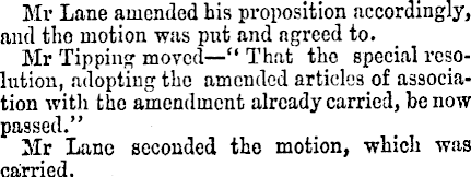 Mr Lane amended his proposition accordingly, and the motion was put and agreed to. Mr Tipping moved—" That the special resolution, adopting the amended articles of association with the amendment already carried, be now passed." Mr Lane seconded tho motion, which was carried.