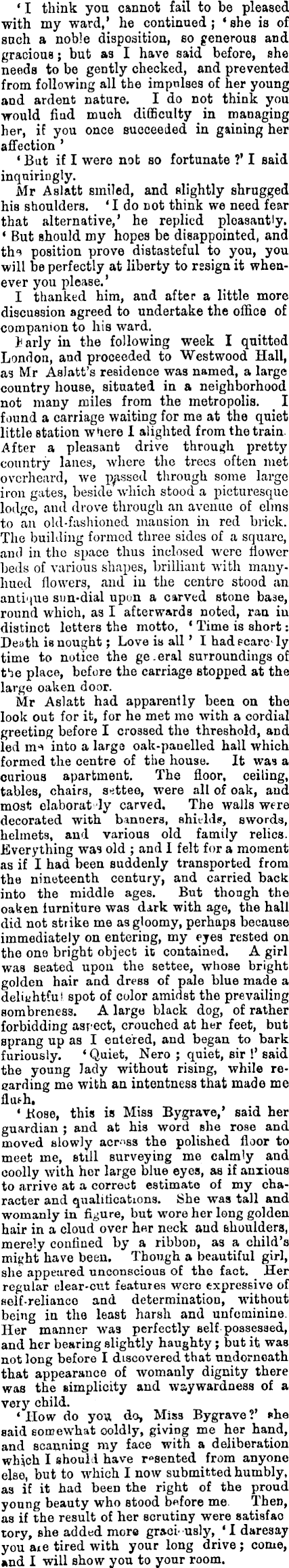 ' I think you cannot fail to be pleased with my ward,' he continued; 'she is of such a noble disposition, so generous and gracious; but as I have said before, she needs to be gently checked, and prevented from following all the impulses of her young and ardent nature. Ido not think you would find much difficulty in managing her, if you once succeeded in gaining her affection ' ' But if I were not so fortunate ?' I said inquiringly. Mr Aslatt smiled, and slightly shrugged his shoulders. 'I do Dot think we need fear that alternative,' he replied pleasantly. • But should my hopes be disappointed, and th°i position prove distasteful to you, you will be perfectly at liberty to resign it whenever you please.' I thanked him, and after a little more discussion agreed to undertake the office of companion to his ward. >arly in the following week I quitted London, and proceeded to Westwood Hall, aa Mr AsJatt's residence was named, a large country house, situated in a neighborhood not many miles from the metropolis. I found a carriage waiting for me at the quiet little station where I alighted from the train After a pleasant drive through pretty country lanes, where the trees often met overheard, Ave passed through some large iron gates, beside which stood a picturesque lodge, and drove through an avenue of elms to an old-fashioned mansion in red brick. The building formed three sides of a square, and in the space thus inclosed were flower beds of various shapes, brilliant with manylmed flowers, and in the centre stood an antique sun-dial upon a curved stone base, round which, as I afterwards noted, ran iu distinct letters the motto, ' Time is short: Death is nought; Love is all' I had ecarc ly time to notice the ge.eral surroundings of fie place, before the carriage stopped at the large oaken door. Mr Aslatt had apparently been on the look out for it, for he met mo with a cordial greeting before I crossed the threshold, and led mi into a largo oak-panelled hall which formed the centre of the house. It was a curious apartment. The floor, ceiling, tables, chairs, settee, were all of oak, and most elaborat ly carved. The walls were decorated with banners, shield*, swords, helmets, and various old family relics. Everything was old ; and I felt for a moment as if I had been suddenly transported from the nineteenth century, and carried back into the middle ages. But though the oaken iurniture was dark with age, the hall did not strike me as gloomy, perhaps because immediately on entering, my eyes rested on the one bright object it contained. A girl was seated upon the settee, whose bright golden hair and dress of pale blue made a deliyhtfu! spot of color amidst the prevailing sombreness. A large black dog, of rather forbidding aspect, crouched at her feet, but sprang up as I entered, and began to bark furiously. ' Quiet, Nero ; quiet, sir !' said the young Jady without rising, while regarding me with an intontness that made me flush. • Boße, this is Miss Bygrave,' said her guardian ; and at his word she rose and moved slowly across the polished floor to meet me, still surveying me calm'y and coolly with her large blue eyes, as if anxious to arrive at a correct estimate of my character and qualitications. She was tall and womanly in figure, but wore her long golden hair in a cloud over h«r neck and shoulders, merely confined by a ribbon, as a child's might have been. Though a beautiful girl, she appeared unconscious of the fact. Her regular clear-cut features were expressive of self-reliance and determination, without being in the least harsh and unfeminine. Her manner was perfectly self possessed, and her bearing slightly haughty; but it was not long before I discovered that undornoath that appearance of womanly dignity there was the simplicity and waywardness of a very child. ' How do you do, Miss Bygrave ?' *he said somewhat ooldly, giving me her hand, and scanning my face with a deliberation which I should have r»sented from anyone else, but to which I now submitted humbly, as if it had been the right of the proud young beauty who stood before me Then, as if the result of her scrutiny were satisfac tory, she added more graci' usly, ' I daresay you aie tired with your long drive; come, and I will show you to your room.