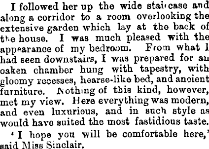 I followed her up tho wide staucase and along a corridor to a room overlooking the extensive garden which lay at tho back of tHe house. I was much pleased with the appearance of my bedroom. From what 1 had seen downstairs, I was prepared for an oaken chamber hung with tapestry, with gloomy recesses, hearse-like bed, and ancient furniture. JNothmgof this kind, however, met my view. Here every thing was modern, and even luxurious, and in such style as would havo suited the most fastidious taste. • I hope you will be comfortable here,' said Miss Sinclair.