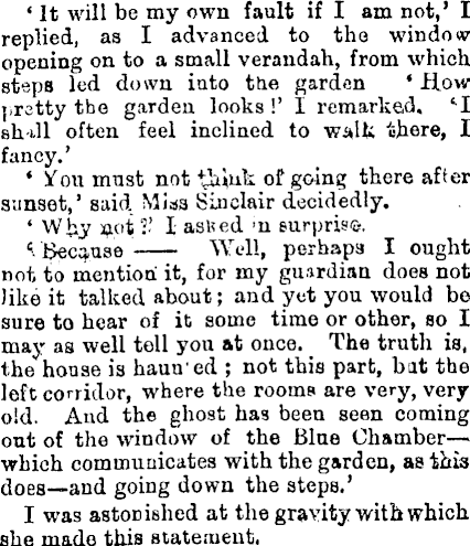 'lt will be my own fault if I am not,' I replied, as I advanced to the window opening on to a small verandah, from which steps led down into the garden * How jretty the garden looks !' I remarked, l I sh-i.ll often feel inclined to walk there, I fancy.' * you must not think of going there after sunset,' said Miss Sinclair decidedly. ' Why apt :•' 1 ashed 'n surprise < Because Well, perhaps I ought not to mention it, for my guardian does not like it talked about; and yet you would be sure to hear of it some time or other, so I may as well tell you at ouco. The truth is, the house is hauned ; not this part, but the left corridor, where the rooms are very, very old. And the ghost has been seen coming out of the window of the Blue Chamber—which commuuicates with the garden, as ihia does—and going down the steps.' I was astonished at the gravity with which she made this statement.