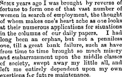 SOMB years ago I was brought by reverse of fortune to form one of that vast number of women in search of employment, the thought of whom makes one's heart ache as cie looks at their numerous applications for situations in the columns of our daily papers. I had long been an orphan, but not a penniless one, tilt a great bank failure, such as have from time to time brought so mnch misery and embarrassment upon the middle classes of society, swept away my little all, and left me entirely dependent upon my own exertions for futtre maintenance.