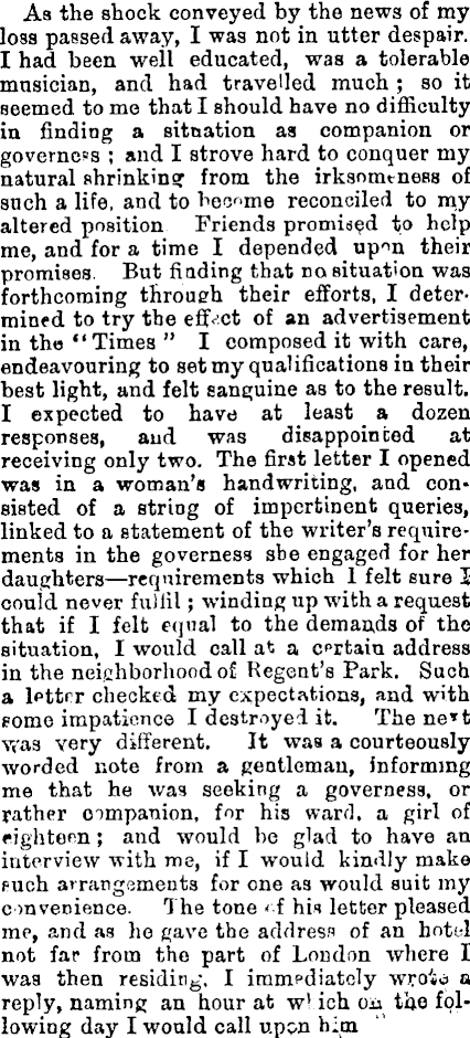 As the shock conveyed by the news of my loss passed away, I was not in utter despair. I had been well educated, was a tolerable musician, and had travelled much ; so it seemed to me that I should have no difficulty in finding a situation as companion or governess ; and I strove hard to conquer my natural shrinkinsr from the irksonuness of such a life, and to became reconciled to my altered position Friends promiaed to help me, and for a time I depended their promises. But finding that no situation was forthcoming through their efforts, I determined to try the effect of an advertisement in tho "Times " I composed it with care, endeavouring to set my qualifications in their best light, and felt sanguine as to the result. I expected to have at least a dozen responses, and was disappointed at receiving only two. The first letter I opened was in a woman's handwriting, and consisted of a string of impertinent queries, linked to a statement of the writer's requirements in the governess she engaged for her daughters—requirements which 1 felt sure I could never fulfil; winding up with a request that if I felt equal to the demands of the situation, I would call at a crtaiu address in the neighborhood of Regent's Park. Such a lHtrr checked my expectations, and with some impatience I destroyei it. The ne*t Y,as very different. It was a courteously worded note from a gentleman, informing me that he was seeking a governess, or rather ompanion, for his ward, a girl of eighteen; and would he glad to have an interview with me, if I would, kindly make Fuch arrangements for one as would suit my convenience. The tone <f hU letter pleased me, and as ho gave the address of an hotel not far from the part of London where I was then residing. I immediately wrot«a a reply, naming an hour at w 1 ich oa the following day I would call upon hip