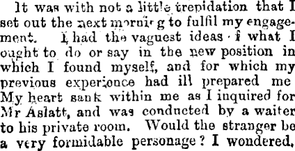 It was with not a little, trepidation that I set out the r»ext mornV g to fulfil my engagement, i, had thu vaguest ideas • i what I ought to do or say in the new position in which I found myself, and for which my previous experience had ill prepared me My heart sank within me as I inquired for Mr Aslatt, and was condncted by a waiter to his private room. Would the stranger bo a very formidable personage? I wondered.