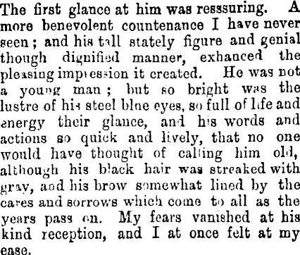 The first glance at him was reassuring. A more benevolent countenance I have never seen ; and his till stately figure and genial though dignified manner, exhanced the pleasing impses-ion it created. He was not a you"tr man ; but so bright was the lustre of hi* steel blue oyes, so full of life and energy their glance, and his words and actions so quick and lively, that no one would have thought of calling him old, although his black hair was streaked with gray, and hi 3 brow somewhat lined by the caves and sorrows which come to all as the years pass <.n. My fears vanished at his kind reception, and I at once felt at my ease.