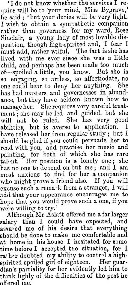 ' I do not know whether the services I rerjuire will be to your mind, Miss Bygrave,' be said ; ' but your duties will be very light. I wish to obtain a sympathetic companion rather than governess for my ward, Rose Sinclair, a young lady of most lovable disposition, though high-spirited and, I fear I must add, rather wilful. The fact is she has lived with me ever siace she was a little child, and perhaps has been made too much of—spoiled a little, you know. But she is so engaging, so artless, so affectiodate, no one could bear to deny her anything. She has had masters and governesses in abundance, but they have seldom known how to manage her. She requires very careful treatment ; she may be led and guided, but she will not be ruled. She has very good abilities, but is averse to application. [ ! have released her from regular study ; but I should be glad if you could persuade her to read with you, and practise her music and painting, for both of which she has rare talent. Her position is a lonely one; she has no one to depend on but me ; and I am most anxious to find for her a companion who might prove a friend also. If you will excuse such a remark from a stranger, I will add that your appearance encourages me to hope that you would prove such a one, if you were willing to try.' Although Mr Aslatt offered mo a far larger salary than I could have expected, and assured me of his desire that everything should be done to make me comfortable and at home in his house I hesitated for some time before I accepted trie situation, for I ra'hT doubted my ability to contrd a highspirited spoiled girl of eighteen. Her guardian's partiality for her evidently led him to think bghly of the difficulties of the post he offered me.