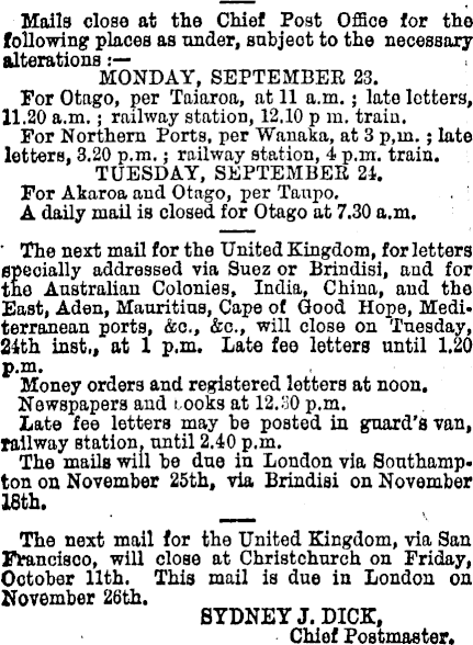 Mails close at the Chief Post Office for the following places as under, subject to the necessary alterations : MONDAY, SEPTEMBER 23. For Otago, per Taiaroa, at 11 a.m.; late letters, 11.20 a.m.; railway station, 12.10 pm. train. For Northern Ports, per Wanaka, at 3 p,m.; late letters, 3.20 p.m.; railway station, 4 p.m. train. TUESDAY, SEPTEMBER 24. For Akaroa and Otago, per Taupo. A daily mail is closed for Otago at 7.30 a.m. The nest mail for the United Kingdom, for letters specially addressed via Suez or Brindisi, and for the Australian Colonies, India, China, and the East, Aden, Mauritius, Cape of Good Hope, Mediterranean ports, &c., &c., will close on Tuesday, 24th inst., at 1 p.m. Late fee letters until 1.20 p.m. Money orders and registered letters at noon. Newspapers and l ooks at 12.30 p.m. Late fee letters may be posted in guard’s van, railway station, until 2.40 p.m. The mails will be due in London via Southampton on November 25th, via Brindisi on November 18th. The next mail for the United Kingdom, via San Francisco, will close at Christchurch on Friday, October 11th. This mail is due in London on November 26th. SYDNEY J. DICK, Chief Postmaster.