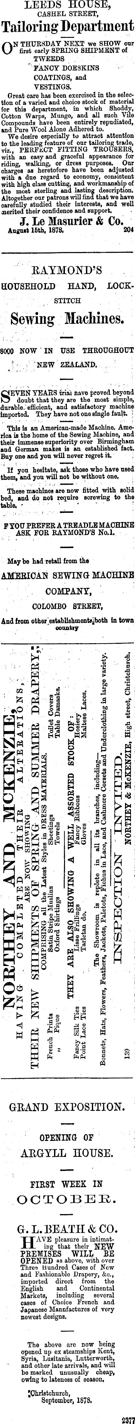 LEEDS HOUSE, CASHEL STREET, Tailoring Department ON THURSDAY NEXT we SHOW our first early SPRING SHIPMENT of TWEEDS FANCY DOESKINS COATINGS, and VESTINGS, Great care has been exercised in the selection of a varied and choice stock of material for this department, in which Shoddy, Cotton Warps, Mungo, and all such Vile Compounds have been entirely repudiated, and Pure Wool Alone Adhered to. We desire especially to attract attention to the leading feature of our tailoring trade, viz., PERFECT FITTING TROUSERS, with an easy and graceful appearance for riding, walking, or dress purposes. Our charges as heretofore have been adjusted with a due regard to economy, consistent with high class cutting, and workmanship of the most sterling and lasting description. Altogether our patrons will find that we have carefully studied their interests, and well merited their confidence and support. J. Le Masurier & Co. August 15th, 1878. 204 RAYMOND’S HOUSEHOLD HAND, LOCKSTITCH Sewing Machines. 8000 NOW IN USE THROUGHOUT NEW ZEALAND. SEVEN YEARS trial nave proved beyond doubt that they are the most simple, durable, efficient, and satisfactory machine Imported. They have not one single fault. This is an American-made Machine, America is the home of the Sewing Machine, and their Immense superiority over Birmingham and Gorman makes is an established fact. Buy one and you will never regret it. If you hesitate, ask those who have used them, and you will not be without one, These machines are now fitted with solid bed, and do not require screwing to the table, ' P YOU PREFER A TREADLE MACHINE ASK FOR RAYMOND’S No.l. May be had retail from the AMERICAN SEWING-MACHINE COMPANY, COLOMBO STREET, And from other ooontvy w P 3 A op a ,0 ffl H H M o o H V N H H m V2& P © H fi H« o > (J2 Q s a H 03-° t* cS hi >» © W3h n .a a 0 © p H H EH O w» m O -n 02 2? H H S O e*a E2 'O h Jj ns QQ s .a a? W Jo B S 3 in s 3 M H mO EH H m M m o £ K” H H Ph Ph M M m a _ B -S n H GRAND EXPOSITION. OPENING OF ARGYLL HOUSE. FIRST WEEK IN OCTOBER. G. L. DEATH & CO. HAVE pleasure in intimating that their NEW PREMISES WILL BE OPENED as above, with over Three tiundred Cases of New and Fashionable Drapery, &c., imported direct from the English and Continental Markets, including several cases of Choice French and Japanese Manufactures of very newest designs. The above arc now being opened up ex steamships Kent, Syria, Lusitania, Lutterworth, and other late arrivals, and will be marked unusually cheap, owing to lateness of season, September, 1878. 8377
