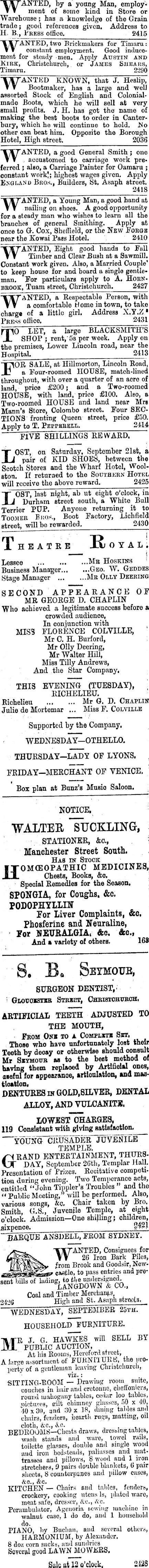 WANTED, by a young Man, employment of some kind in Store or Warehouse ; has a knowledge of the Grain trade; good references given. Address to H 8., Press office, 2415 WANTED, two Brickmakers for Timaru : constant employment. Good inducement for steady men. Apply Austin and Kirk, Christchurch, or James Shears, Timaru. 2290 ANTED KNOWN, that J. Healip, Bootmaker, has a large and well assorted Stock of English and Colonialmade Boots, which ho will sell at very small profits. J. H, has got the name of making the best boots to order in Canterbury, which he will continue to hold. No other can beat him. Opposite the Borough Hotel, High street, 2036 WANTED, a good General Smith ; one accustomed to carriage work preferred ; also, a Carriage Painter for Oamaru ; constant work!; highest wages given. Apply England Bros., Builders, St. Asaph street. 2418 WANTED, a Young Man, a good hand at nailing on shoes. A good opportunity for a steady man who wishes to learn all the branches of general Smithing. Apply at once to Or. Cox, Sheffield, or the New Forge near the Kowai Pass Hotel. 2410 WANTED, Eight good hands to Full Timber and Clear Bush at a Sawmill. Constant work given. Also, a Married Couple' to keep house for and board a single gentleman. For particulars apply to A, Hornbrook, Tuam street, Christchurch. 2427 WANTED, a Respectable Person, with a comfortable Home in town, to take charge of a little girl. Address X.Y.Z* Press office. 2431 TO LET, a large BLACKSMITH’S SHOP ; rent, 5s per week. Apply on the premises, Lower Lincoln road, near the Hospital. 2413 FOR SALE, at Hillmorton, Lincoln Road, a Four-roomed HOUSE, match-lined throughout, with over a quarter of an acre of land, price £200; and a Two-roomed HOUSE, with land, price £IOO. Also, a Two-roomed HOUSE and land near Mrs Mann’s Store, Colombo street. Four SECTIONS fronting Queen street, price £SO. Apply to T. Pepbkbell. 2414 FIVE SHILLINGS REWARD. LOST, on Saturday, September 21st, a pair of KID SHOES, between the Scotch Stores and the Wharf Hotel, Woolston. If returned to the Southern Hotel will receive the above reward. 2425 LOST, last night, ab ut eight o’clock, in Durham street south, a White Bull Terrier PUP. Anyone returning _it to Toomer Bros,, Boot Factory, Lichfield street, will be rewarded. 2430 Theatre Royal. Lessee ... ... ...Me Hoskins Business Manager Geo. W. Geddes Stage Manager ... ...Mr Olly Deering SECOND APPEARANCE OF MR GEORGE D. CHAPLIN Who achieved a legitimate success before a crowded audience, In conjunction with MISS FLORENCE COLVILLE, Mr C. H. Burford, Mr Olly Deering, Mr Walter Hill, Miss Tilly Andrews, And the Star Company, THIS EVENING (TUESDAY), RICHELIEU. Richelieu Mr 6. D. Chaplin Julie de Mortemar ... Miss F. Colville Supported by the Company. WEDNESDAY—OTHELLO. THURSDAY—LADY OF LYONS. FRIDAY—MERCHANT OF VENICE. Box plan at Bunz’a Music Saloon. NOTICE. WALTER SUCKLING, STATIONER, &c., Manchester Street South. Has in Stock Homoeopathic medicines, Chests, Books, &o. Special Remedies for the Season, SPONGIA, for Coughs. &c. PODOPHYLLIN For Liver Complaints, &c, Phosferine and Neuraline, For NEURALGIA, &e. &c., And a variety of others. 168 SURGEON DENTIST, Glouobster Street, Christchurch, RTIPICIAL TEETH ADJUSTED TO THE MOUTH, From Onb to a Complbtb Sbt. Those who have unfortunately lost their ieth by decay or otherwise should consult r Sbymour as to the best method of ,ving them replaced by Artificial ones, efnffor appearance, articulation, and manlatlon, ENTURES in GOLD,SILVER, DENTAL ALLOY, AND VULCANITE. LOWEST CHARGES, 9 Conalstant with giving satisfaction, ~YOUNG~CRUSADER JUVENILE TEMPLE. RAND ENTERTAINMENT, THURB- - DAY, September 26th, Templar Hall, escalation of Prizes. Recitative competiin daring evening. Two Temperance acts, titled “John Tippler’s Troubles ” and the Public Meeting,” will be performed. Also, rioua songs, Ac, Chair taken by Bro, lith, G.S., Juvenile Temple, at eight lock. Admission—One shilling; children, :pence. 2421 BARQUE ANSDELL, FROM SYDNEY WANTED, Consignees for 26 Iron Bark Piles, /rom Brook and Goodsir, NewMB3ng caefcle, to pass entries and prej of lading, to the undersigned. LANGDOWN & CO., Coal and Timber Merchants. High and St. Asaph streets. DNESDAYTsEPTEMBER 25th. HOUSEHOLD FURNITURE. J. G. HAWKES will SELL BY PUBLIC AUCTION, At his Rooms, Hereford street, assortment of FURNITURE, the proof a gentleman leaving Christchurch, viz.: . ING-ROOM Drawing room suite, ouches in hair and cretonne, chelfonieis, ound mahogany tables, cedar 100 tables, icfcuves, edit chimney glasses, 50 x 40, 0 x 3h, and 30 s 18, dining tables and hairs, fenders, hearth rugs, matting, oil loth, Ac., Ac. ROOMS—Chests draws, dressing tables, rash stands and ware, towel rails, oilette glasses, double and single wood nd iron bedsteads, paliassos and matrasses and pillows, b wood and 1 iron tret diets, 0 pairs double blankets, 6 pair heets, 8 counterpanes and pillow cases, so., &c. IHEN Chairs and tables, fenders, rockery, cooking uteus Is, plated ware, ieat safe, dresser, Ac., Ac. übulator, Ageuoria sewing machine in ralnut case, 1 do do, and 1 household o. iO, by Buchan, and several others, lAEMONIUM, by Alexander, corn sacks, and sundries M good LAWN MOWERS. Sale at 12 o’clock, 2128