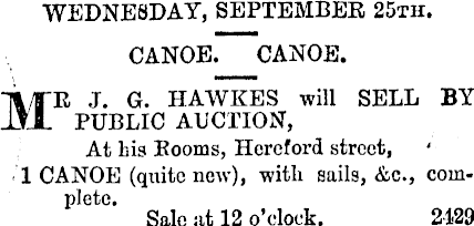 WEDNESDAY, SEPTEMBER 25th. CANOE. CANOE. MR J. G. HAWKES will SELL BY PUBLIC AUCTION, At his Rooms, Hereford street, 1 CANOE (quite new), with sails, &c., complete. Sale at 12 o’clock. 2129