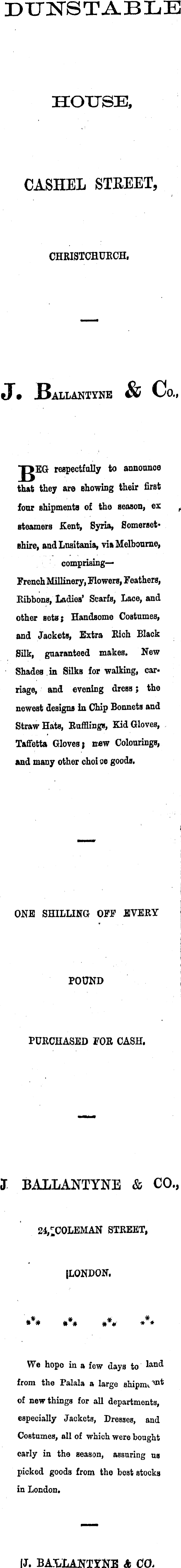 DUNSTABLE HOUSE, CASHEL STREET, TOG respectfully to announce that they are showing their first four shipments of the season, ex steamers Kent, Syria, Somerset* shire, andLnaitania, via Melbourne, French Millinery, Flowers, Feathers, Ribbons, Ladies’ Scarfs, Lace, and other sots; Handsome Costumes, and Jackets, Extra Rich Black Silk, guaranteed makes. New Shades in Silks for walking, carriage, and evening dress; the newest designs in Chip Bonnets and Straw Hats, Rufflings, Kid Gloves, Taffetta Gloves; new Colourings, and many other choice goods. ONE SHILLING OFF EVERY POUND PURCHASED FOR CASH. J BALLANTYNE & CO., 24, STEBBT, We hope in a few days to l an d from the Palala a large shiprru of new things for all departments, especially Jackets, Dresses, and Costumes, all of which were bought early in the season, assuring ua picked goods from the best stocks in London. CHRISTCHURCH, J • JSallantynb & Co. comprising—* {LONDON, |J. BALLANTYNE A CO ,