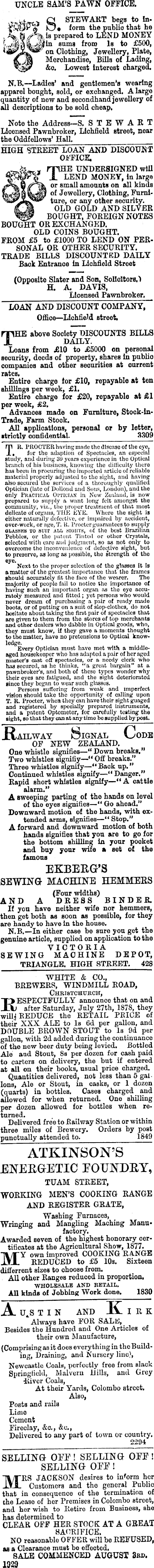 UNCLE SAM’S PAWN OFFICE. Cl STEWART begs to inO• form the public that ho is prepared to LEND MONEY kJlln sums from la to £SOO, on Clothing, Jewellery, Plate, Merchandise, Billa of Lading, &o. Lowest Interest charged. N.B. —Ladles’ and gentlemen’s wearing apparel bought, sold, or exchanged. A largo quantity of new and secondhand jewellery of all descriptions to be sold cheap. Note the Address—S. STEWART Licensed Pawnbroker, Lichfield street, near the Oddfellows’ Hall. HIGH STREET LOAN AND DISCOUNT OFFICE. The undersigned win LEND MONEY, in largo or small amounts on all kinds of Jewellery, Clothing, Furniture, or any other security. OLD GOLD AND SILVER BOUGHT, FOREIGN NOTES BOUGHT OR EXCHANGED. OLD COINS BOUGHT. FROM £5 to £IOOO TO LEND ON PERSONAL OR OTHER SECURITY. TRADE BILLS DISCOUNTED DAILY Back Entrance in Lichfield Street (Opposite Slater and Son, Solicitors,') H. A. DAVIS, Licensed Pawnbroker, LOAN AND DISCOUNT COMPANY, Office—Lichfield street. THE above Society DISCOUNTS BILLS DAILY. Loans from £lO to £SOOO on personal security, deeds of property, shares in public companies and other securities at current rates. Entire charge for £lO, repayable at ten shillings per week, £l. Entire charge for £2O, repayable at £1 per week, £2. Advances made on Furniture, Stock-In-Trade, Farm Stock, All applications, personal or by letter, strictly confidential. 3309 TR. PROCTER having made the disease of the eye, , for the adaption of Spectacles, an especial study, and during SO years experience in the Optical branch of his business, knowing the difficulty there has been in procuring the imported article of reliable material properly adjusted to the sight, and having also secured the services of a thoroughly qualified Optician (late of Dollond and Sons, London), and the only Practical Optician in New Zealand, is now prepared to supply a want long felt amongst the community, viz., the proper treatment of that most delicate of organs, THE EYE. Where the sight is either naturally defective, or impaired by accident, over-work, or age, T. R. Procter guarantees to supply olassks to suit all sights, of the best Brazilian Pebbles, or the patent Tinted or other Crystals, selected with care and judgment, so as not only to overcome the inconvenience of defective sight, but to preserve, as long as possible, the strength of the eye. Next to the proper selection of the glasses it is a matter of the greatest importance that the frames should accurately fit the face of the wearer. The majority of people fail to notice the importance of having such an important organ as the eye accurately measured and fitted ; yet persons who would never dream of purchasing a pair of ready made boots, or of putting on a suit of slop-clothes, do not hesitate about taking the first pair of spectacles that are given to them from the stores of top merchants and other dealers who dabble in Optical goods, who, they must know, if they gave a moments thought to the matter, have no pretensions to Optical knowledge. Every Optician must have met with a middleaged housekeeper who has adapted a pair of her aged master’s oast off spectacles, or a needy clerk who has secured, as he thinks, ‘‘a great bargain” at a pawnbroker’s, and both of these types wonder why their eyes are fatigued, and the sight deteriorated since they began to wear such glasses. Persons suffering from weak and imperfect vision should take the opportunity of calling upon T. R. Procter, when they can have their sight guaged and registered by specially prepared instruments, and a patent Optometer, for carefully testing the sight, so that they can at any time be supplied by post. R AILWAY teIGNAL CoDB OF NEW ZEALAND. One whistle signifies—“ Down breaks.” Two whistles signifiy —“ Off breaks.” Three whistles signify—“ Back up. ” Continued whistles signify—“ Danger.” Rapid short whistles signify—“ A cattle alarm.” A sweeping parting of the hands on level of the eyes signifies —“ Go ahead.” Downward motion of the hands, with extended arms, signifies—“ Stop.” A forward and downward motion of both hands signifies that you are to go for the bottom shilling In your pocket and bay your wife a set of the famous EKBEHG’S SEWING MACHINE HEMMEES (Pour widths) AND A DRESS BINDER. If you have neither wife nor hemmers, then get both as soon as possible, for they are handy to have in the house, N.B.—ln either case be sure yon get the genuine article, supplied on application to the VICTORIA SEWING MACHINE DEPOT, TRIANGLE, HIGH STREET. 428 WHITE & CO., BREWERS, WINDMILL ROAD, Christchurch, “F> ESPECTFULLY announce that on and after Saturday, July 27th, 1878, they will.-j REDUCE the RETAIL PRICE of their XXX ALE to Is fid per gallon, and DOUBLE BROWN STOUT to Is 9d per gallon, with 2d added during the continuance of the new beer duty being levied. Bottled Ale and Stout, 8a per dozen for cash paid to carters on delivery, the but if entered at all on their books, usual price charged. Quantities delivered, not less than 5 gal lons, Ale or Stout, in casks, or 1 dozen (quarts) in bottles. Cases charged and allowed for when returned. One shilling per dozen allowed for bottles when returned. Delivered free to Railway Station or within three miles of Brewery. Orders by post punctually attended to. 1849 ATKINSON’S ENEEGKETIC EOUKDEY, TUAM STREET, WORKING MEN’S COOKING RANGE AND REGISTER GRATE, Washing Furnaces, Wringing and Mangling Maching Manufactory. Awarded seven of the highest honorary certificates at the Agricultural Show, 1877. MY own improved COOKING RANGE REDUCED to £5 10s. Sixteen differrent sizes to choose from. All other Ranges reduced in proportion. WHOLESALE AND RETAIL. All kinds of Jobbing Work done. 1830 A. U,S TIN AND K IRK Always have FOR SALE, Besides the Hundred and One Articles of their own Manufacture, (Comprising as it does everything in the Building, Draining, and Nursery line), Newcastle Coals,