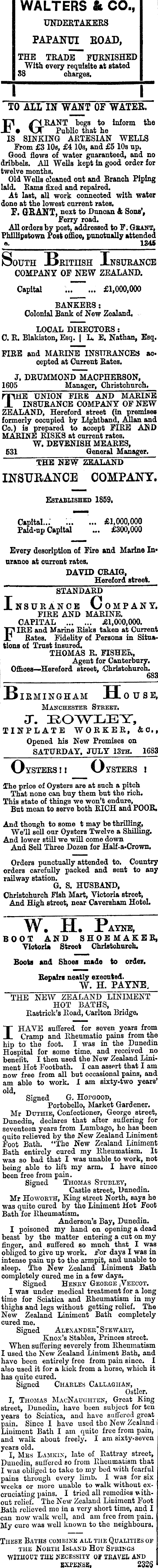WALTERS & CO., UNDERTAKERS PAPANUI EOAD, THE TRAD~ FURNISHED With every requisite at stated 88 charges. I TO ALL IN WANT OF WATER. i. RANT begs to Inform the • Public that he IS SINKING ARTESIAN WELLS From £3 10s, £4 10s, and £5 10a up. Good flows of water guaranteed, and no dribbels. All Wells kept in good order for twelve months. Old Wells cleaned out and Branch Piping laid. Rams fixed and repaired. At last, all work connected with water done at the lowest current rates. F. GRANT, next to Duncan & Sons’, Ferry road. All orders by post, addressed to F. Gbant, Philllpstown Post office, punctually attended «. 1345 South Brithsh Insurance COMPANY OF NEW ZEALAND. Capital ... £1,000,000 BANKERS: Colonial Bank of New Zealand, LOCAL DIRECTORS ; C. R. Blakiston, Esq. J L. E. Nathan, Esq. FIRE and MARINE INSURANCES accepted at Current Rates. J. DRUMMOND MACPHERSON, 1605 Manager, Christchurch. The union fire and marine INSURANCE COMPANY OF NEW ZEALAND, Hereford street (in premises formerly occupied by Llghtband, Adlan and Co.) is prepared to accept FIRE AND MARINE RISKS at current rates. W. DEVENIBH MEARES, 531 General Manager. THE NEW ZEALAND INSURANCE COMPANY. Established 1859. Capital... £1,000,000 Paid-up Capital ... £300,000 Every description of Fire and Marine Inurance at cnrrent rates. DAVID CRAIG, Hereford street. STANDARD Insurance Company. FIRE AND MARINE. CAPITAL £1,000,000. FIRE and Marine Risks taken at Current Rates, Fidelity of Persons in Situations of Trust insured. THOMAS R. FISHER, Agent for Canterbury. Offices—Hereford street, Christchurch. 683 B IRMINGHAM H OUSE, Manchester Street. T. EOWLEY, TINPLATE WORKER, &0., Opened his Now Premises on SATURDAY. JULY 13th. 1683 Oysterssi Ousters i The price of Oysters are at such a pitch That none can buy them but the rich. This state of things we won’t endure, But mean to serve both RICH and POOR. And though to some t may be thrilling, We’ll sell our Oysters Twelve a Shilling, And lower still we will come down And Sell Three Dozen for Half-a-Crown. Orders punctually attended to. Country orders carefully packed and sent to any railway station. G. S. HUSBAND, Christchurch Fish Mart, Victoria street, And High street, near Caversham Hotel. W, H. Payne, BOOT AND SHOEMAKER, Victoria Street Christchurch. Boots and Shoes made to order. Repairs neatly executed. W. H. PAYNE. THE NEW ZEALAND LINIMENT HOT BATHS, Eastrick’s Road, Carlton Bridge. I HAVE suffered for seven years from Cramp and Rheumatic pains from the hip to the foot. I was in the Dunedin Hospital for some time, and received no benefit. I then used the New Zealand Liniment Hot Footbath. I can assert that lam now free from all but occasional pains, and am able to work, I am sixty-two years’ old, Signed G. Hopgood, Portobello, Market Gardener. Mr Duthib, Confectioner, George street, Dunedin, declares that after suffering for seventeen years from Lumbago, he has been quite relieved by the New Zealand Liniment Foot Bath. “The New Zealand Liniment Bath entirely cured my Rheumatism. It was so bad that I was unable to work, not being able to lift my arm. I have since been free from pain. Signed Thomas Stubley, Castle street, Dunedin. Mr Ho worth, King street North, says he was quite cured by the Liniment Hot Foot Bath for Rheumatism. Anderson’s Bay, Dunedin, I poisoned my hand on opening a dead beast by the matter entering a cut on my finger, and suffered so much that I was obliged to give up work. For days I was in intense pain up to the armpit, and unable to sleep. The New Zealand Liniment Bath completely cured me in a few days. Signed Henry George .Veecot. I was under medical treatment for a long time for Sciatica and Rheumatism in my thighs and legs without getting relief. The New Zealand Liniment Bath completely cured me. Signed Alexander" Stewart, Knox’s Stables, Princes street. When suffering severely from Rheumatism I used the New Zealand Liniment Bath, and have been entirely free from pain since. I also used it for a kick from a horse, which it has quite cured. Signed Charles Callaghan, Ostler. I, Thomas MacNaughten, Groat King street, Dunedin, have been subject for ten years to Sciatica, and have suffered great pain. Since I have used the New Zealand i Liniment Bath I am quite free from pain, and walk about freely. I am sixty-seven years old. I, Mas Lamkin, late of Rattray street, Dunedin, suffered so from Rheumatism that I was obliged to take to my bed with fearful pains through every limb. I was for six weeks or more unable to walk without excruciating pains. I tried all remedies without relief. The New Zealand Liniment Foot Bath relieved me in a very short time, and I can now walk well, and am free from pain. My euro was well known to the neighbours. These Baths combine all the Qualities of the North Island Hot Springs WITHOUT THIS NECESSITY OJ TRAVEL AND EXPENSE, 2328