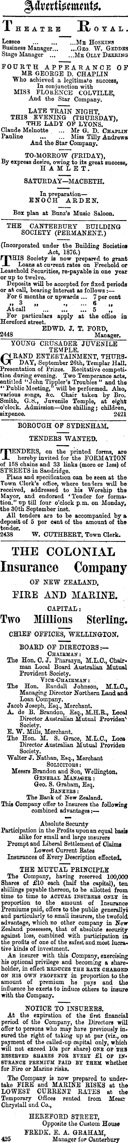 Mmxtmwnfa . HEAIBE JLXi 0 Y A L . Lessee Me Hoskins Business Manager Geo. W. Geddes Stage Manager Me Olly Dubbing FOURTH APPEARANCE OF MR GEORGE D. CHAPLIN Who achieved a legitimate success, In conjunction with MIS 3 FLORENCE COLVILLE, And the Star Company. LATE TRAIN NIGHT, TRIS EVENING (THURSDAY THE LADY OF LYONS. Claude Melnotte ... Mr 6. D. Chaplin Pauline ... ... Miss Tilly Andrews And the Star Company. TO-MORROW (FRIDAY), By express desire, owing to its great success, HAMLET. SATURDAY—MACBETH. In preparation— ENOCH ARDEN. Box plan at Bunz's Music Saloon. THE CANTEKBURY BUILDING SOCIETY (PERMANENT.) (Incorporated under the Building Societies Act, 1876.) Loans at current rates on Freehold or Leasehold Securities, re-payable in one year or up to twelve. Deposits will be accepted for fixed periods or at call, bearing interest as follows : For 6 months or upwards ... 7 per cent ~ 3 „ ~ ... 6 „ At call 5 „ For particulars apply at the office in Hereford street. EDWD. J. T. FORD, 2448 Manager. YOUNG CRUSADER JUVENILE TEMPLE. a RAND ENTERTAINMENT, THURSDAY, September 26th, Templar Hall. Presentation of Prizes. Recitative competition during evening. Two Temperance acts, entitled "John Tippler's Troubles " and the " Public Meeting," will be performed. Also, various songs, &c. Chair taken by Bro. Smith, G.S., Juvenile Temple, at eight o'clock. Admission—One shilling; children, sixpence. 2421 BOROUGH OF SYDENHAM. TENDERS WANTED. LENDERS, on the printed forms, are hereby invited for the FORMATION of 158 chains and 33 links (more or less) of STREETS in Sandridge. Plans and specification can be seen at the Town Clerk's office, where tenders will be received, addressed to his Worship the Mayor, and endorsed ' Tender for formation." up till four o'clock p.m. on Monday, the 30th September inst. All tenders ars to be accompanied by a deposit of 5 per cent of the amount of the tender. 2438 W. CUTHBERT, Town Clerk. THE COLONIAL Insurance Company OF NEW ZEALAND, FIRE AND MARINE. CAPITAL : Two MiUions Sterling. CHIEF OFFICES, WELLINGTON. BOARD OF DIRECTORS : Chaibman : The Hon. 0. J. Pharazyn, M.L.0., Chairman Local Board Australian Mutual Provident Society. Vice-Chaibman : The Hon. Randall Johnson, M.L.0., Managing Director Northern Land and Loan Company. Jacob Joseph, Esq., Merchant. A. de B. Brandon, Esq., M.H.R., Local Director Australian Mutual Providen v Society. E. W. Mills, Merchant. The Hon. M. S. Grace, M.L.0., Looa Director Australian Mutual Providen Society. Walter J. Nathan, Esq., Merchant SOLICITOBS: Messrs Brandon and Son, Wellington. Genebal Manages : Geo. S. Graham, Esq. Bankebs : The Bank of New Zealand. This Company offer to Insurers the following combined advantages:— Absolute Security Participation in the Profits upon an equal basis alike for small and large insurers Prompt and Liberal Settlement of Claims Lowest Current Rates Insurances of Every Description effected. THE MUTUAL PRINCIPLE The Company, having reserved 100,000 Shares of £lO each (half the capital), ten shillings payable thereon, to be allotted from time to time to actual insubbbs only in proportion to the amount of Insurance Premiums paid, offers to the pub lie generallyi and particularly to small insurers, the twofold advantage, which no other company in New Zealand possesses, that of absolute security against loss, combined with participation in the profits of one of the safest and most lucrative kinds of investment. An insurer with this Company, exercising his optional privilege and becoming a shareholder, in effect seduces the bate chabged on His own pbopebtx in proportion to the amount of premium he pays and the influence he exerts to induce others to insure with the Company. NOTICE TO INSURERS. At the expiration of the first financial period of the Company, the Directors will offer to persons who may have previously insured the right of taking up at par (viz., on payment of the called-up capital only, which will not exceed 10s per share) one of'thb BESEBVED SHABEB FOB EVEEY £1 OF INSTJBANCE FBEMIUM PAID BY THEM whethe* for Fire or Marine risks. The Company is now prepared to undertake FIRE and MARINE RISKS at theLOWEST CURRENT RATES at the Temporary Offices rented from Mesas Chrystall and Co., HEREFORD STREET, Opposite the Custom House FREDK. E. A. GRAHAM, 425 Manager for Canterbury