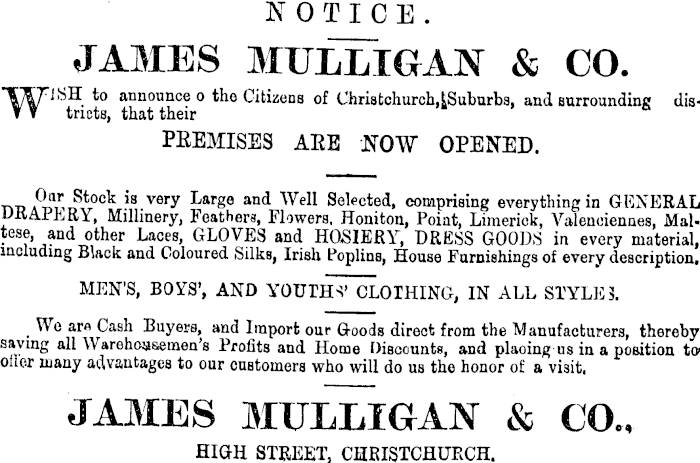 NOTICE. JAMES MULLIGAN & CO. FJSH to announce o the Citizens of and surrounding districts, that their PREMISES ARE NOW OPENED. rn? UK APERY, Millinery, Feathers, Flowers, Honiton, Point, Limerick, Valenciennes, Maitese, and other Laces, GLOVES and HOSIERY, DRESS GOODS in every material, including Black and Coloured Silks, Irish Poplins, House Furnishings of every description. MEN'S, BOYS*, AND YOUTHS' CLOTHING, IN ALL STYLES. We ara Cash Buyers, and Import our Goods direct from the Manufacturers, thereby saving all Warehousemen's Profits and Home Discounts, and plaoing us in a position to oiler many advantages to our customers who will do us the honor of a visit. JAMES MULLIGAN & CO., HIGH STREET, CHRISTCHURCH.