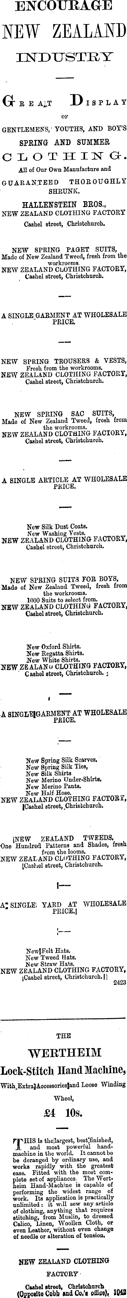 ENCOURAGE NEW ZEALAND INDUSTRY R E AjiT ISPLAY GENTLEMENS, YOUTHS, AND BOY'S SPRING AND SUMMER CLOTHINGK All of Our Own Manufacture and GUARANTEED THOROUGHLY SHRUNK. HALLENSTEIN BROS., NEW ZEALAND CLOTHING FACTORY Caßhel street, Christchurch. NEW SPRING PAGET SUITS, Made of New Zealand Tweed, fresh from the workrooms. NEW ZEALAND CLOTHING FACTORY, Cashel street, Christchurch. A SINGLE GARMENT AT WHOLESALE PRICE. NEW SPRING TROUSERS & VESTS, Fresh from the workrooms. NEW ZEALAND CLOTHING FACTORY, Cashel stieet, Christchurch. NEW SPRING SAC SUITS, Made of New Zealand Tweed, fresh from the workrooms. NEW ZEALAND CLOTHING FACTORY, Cashel street, Christchurch. A SINGLE ARTICLE AT WHOLESALE PRICE. New Silk Dust Coats. New Washing Vests. „_„„ NEW ZEALAND CLOTHING FACTORY, Cashel street, Christchurch. NEW SPRING SUITS FOR BOYS, Made of New Zealand Tweed, fresh from the workrooms. 1000 Suits to select from. NEW ZEALAND CLOTHING FACTORY, Cashel street, Christchurch. New Oxford Shirts. New Regatta Shirts. lHew White Shirts. NEW ZEALANo CLOTHING FACTORY, Cashel street, Christchurch. j A SINGLEIGARMENT AT WHOLESALE PRICE. New Spring Silk Scarves. New Spring Silk Ties, New Silk Shirts New Merino Under-Shirts. New Merino Pants. New Half Hose. NEW ZEALAND CLOTHING FACTOR*, |Cashel street, Christchurch. [NEW ZEALAND TWEEDS. One Hundred Patterns and Shades, fresh from the looms. NEW ZEAL AND CLOTHING FACTORY, [Cashel street, Christchurch. A" SINGLE; YARD AT WHOLESALE PRICE.I NewfFelt Hats. New Tweed Hats. New Straw Hats. NEW ZEALAND CLOTHING FACTORY, iCashel street, Christchurch. 11 1 2423 WERTHEIM Lock-Stitch Hand Machine, Loose Winding Wheel, M 10s. HP HIS is thejlargest, _i and most powerful handmachine in the world. It cannot be be deranged by ordinary use, and works rapidly with the greatest ease. Fitted with the most complete set of appliances. The Wertheim Hand-Machine is capable of performing the widest range of work. Its applieation is practically unlimited : it will sew any article of clothing, anything that requires stitching, from Muslin, to dressed Calico, Linen, Woollen Cloth, or even Leather, withont even change of needle or alteration of tension, NEW ZEALAND CLOTHING FACTORY Caahel street, Chrlatohurcb (Opposite Cobb and Co.'o office), 1042