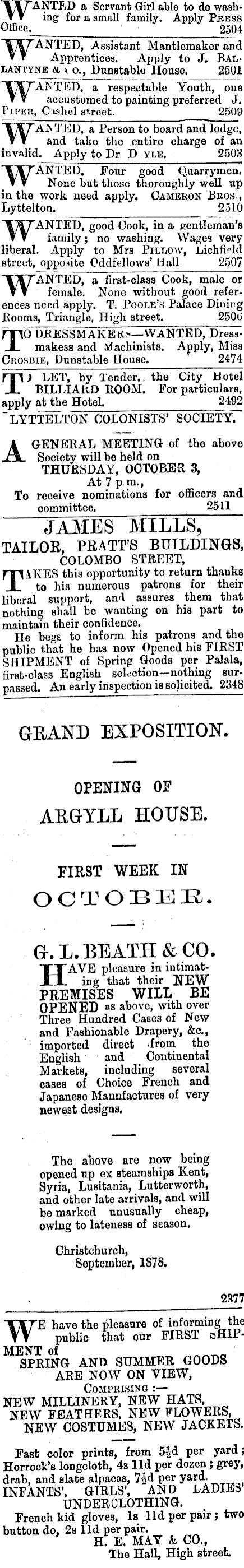 RANTED a Servant Girl able to do wash- * v iug for a small family. Apply Press Office. 2504 ANTED, Assistant Mantlemaker and » r Apprentices. Apply to J. Ballantyne & >. 0., Dunstable House. 2501 RANTED, a respectable Youth, one accustomed to painting preferred J. Piper, Cashel street. 2509 TA> LED, a Person to board and lodge, » t and take the entire charge of an invalid. Apply to Dr D yle. 2503 WANTED, Four good Quarrymen. None but those thoroughly well up in the work need apply. Cameron Bros, Lyttelton. 2510 ANTED, good Cook, in a gentleman a t » family; no washing. Wages very liberal. Apply to Mrs Pillow, Lichfield street, opposite Oddfellows' Hall 2507 ANTED, a first-class Cook, male or t female. None without good references need apply, T. Poole's Palace Dining Booms, Triangle, High street. 250 u \0 DRESSMAKER—WANTED, Dress- . makess and Machinists. Apply, Miss Crosbie, Dunstable House. 2474 ) LET, by Tender, the City Hotel BILLIARD ROOM. For particulars, apply at the Hotel. 2492 ~LYTTELTON~OOLONISTS' SOCIETY. » GENERAL MEETING of the above . Society will be held on THURSDAY, OCTOBER 3, At 7 p.m., To receive nominations for officers and committee. 25 LI JAMES MILLS, TAILOE, PRATT'S BUTLDINGS, COLOMBO STREET, lAKES this opportunity to return thanks to his numerous patrons for their liberal support, and assures them that nothing shall be wanting on his part to maintain their confidence. He beg£ to inform his patrons and the public that ho has now Opened his FIRST SHIPMENT of Spring Goods per Palala, first-class English selection—nothing surpassed. An early inspection is solicited. 2348 GRAND EXPOSITION. OPENING OF ARGYLL HOUSE. FIRST WEEK IN G.L.BEATII&CO. """"AVE pleasure in intimat- _ ing that their NEW PREMISES WILL BE OPENED as above, with over Three Hundred Cases of New and Fashionable Drapery, &C, imported direct from the English and Continental Markets, including several cases of Choice French and Japanese Mannfactures of very newest designs. The above are now being opened up ex steamships Kent, Syria, Lusitania, Lutterworth, and other late arrivals, and will be marked unusually cheap, owing to lateness of season. Christchurch, September, IS7B. , E have the pleasure of informing the public that our FIRST SHIPMENT of „*^ a SPRING AND SUMMER GOODS ARE NOW ON VIEW, Comprising : NEW MILLINERY, NEW HATS, NEW FEATHKRS, NEW FLOWERS, NEW COSTUMES, NEW JACKETS. Fast color prints, from s£d per yard; Horrock's longcloth, 4s lid per dozen; grey, drab, and slate alpacas, 7£d per yard. INFANTS', GIRLS', AND LADIES' UNDERCLOTHING. French kid gloves, Is lid per pair ; two button do, 2s lid per pair. H. E. MAY & CO., The Hall, High street.