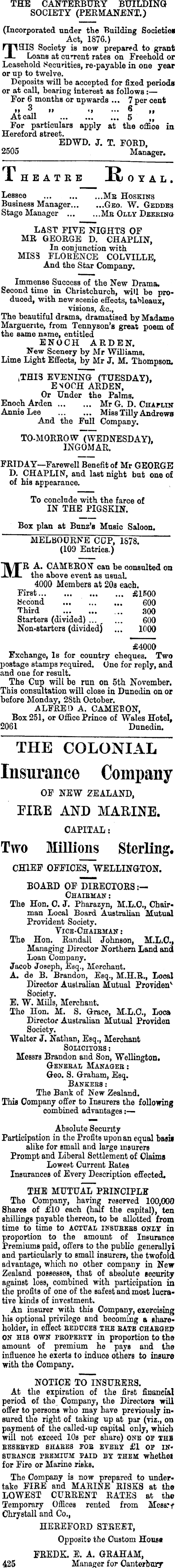 THE CANTERBURY BUILDING SOCIETY (PERMANENT.) (Incorporated under the Building Societies Act, 1876.) rxrxTa a-." i._ ■ ji j.. t Loans at current rates on Freehold or Leasehold Securities, re-payable in one year or up to twelve. Deposits will be accepted for fixed periods or at call, bearing interest as follows : For 6 months or upwards ... 7 per cent " 3 „ " •> ••• 6 »» At call 5 „ For particulars apply at the office in Hereford street. EDWD. J. T. FORD, 2505 Manager. HEA T R E Lessee Business Manager... Stage Manager ... ' 0 Y A L. ...Me Hoskins ...Geo. W. Geddes ...Me Olly Deeeing LAST FIVE NIGHTS OF MR GEORGE D. CHAPLIN, In conjunction with MIS 3 FLORENCE COLVILLE, And the Star Company. Immense Success of the New Drama. Second time in Christchurch, will be produced, with new scenic effects, tableaux, visions, &c, The beautiful drama, dramatised by Madame Marguerite, from Tennyson's great poem of the same name, entitled ENOCH ARDEN. New Scenery by Mr Williams. Lime Light Effects, by Mr J. M. Thompson. ,THI3 EVENING (TUESDAY), ENOCH ARDEN, Or Under the Palms. Enoch Arden Mr G. D. Chaplin Annie Lee Miss Tilly Andrews And the Full Company. TO-MORROW (WEDNESDAY), INGOMAR. FRlDAY—Farewell Benefit of Mr GEORGE D. CHAPLIN, and last night but one of of his appearance. To conclude with the farce of IN THE PIGSKIN. Box plan at Bunz's Mußic Saloon. MELBOURNE COP, 1578. (109 Entries.) R A. CAMERON can be consulted on the above event as usual. 4000 Members at 20s each. First £ISOO Second 600 Third ... 300 Starters (divided) .... ... 600 Non-Btartera (divided) ... 1000 £4OOO Exchange, Is for country cheques. Two postage stamps required. One for reply, and and one for result. The Cup will be run on sth November. This consultation will close in Dunedin on or before Monday, 2Sth October. ALFRED A. CAMEBON, Box 251, or Office Prince of Wales Hotel, 2061 Dunedin. THE COLONIAL Insurance Company OF NEW ZEALAND, FIRE AND MARINE. CAPITAL: Two Millions Sterling. CHIEF OFFICES, WELLINGTON. BOARD OF DIRECTORS : Chaieman .- The Hon. C. J. Pharazyn, M.L.C., Chairman Local Board Australian Mutual Provident Society. Vice-Chaieman : The Hon. Randall Johnson, M.L.C., Managing Director Northern Land and Loan Company. Jacob Joseph, Esq., Merchant. A. de B. Brandon, Esq., M.H.R., Local Director Australian Mutual Providen v Society. E. W. Mills, Merchant. The Hon. M. S. Grace, M.L.C., Loca Director Australian Mutual Providen Society. Walter J. Nathan, Esq., Merchant Solioitoes : Messrs Brandon and Son, Wellington. Geneeal Manages : Geo. S. Graham, Esq. Bankees : The Bank of New Zealand. This Company offer to Insurers the following combined advantages:— Absolute Security Participation in the Profits upon an equal basis alike for small and large insurers Prompt and Liberal Settlement of Claims Lowest Current Rates Insurances of Every Description effected, THE MUTUAL PRINCIPLE The Company, having reserved 100,000 Shares of £lO each (half the capital), ten shillings payable thereon, to be allotted from time to time to actual insubebs only in proportion to the amount of Insurance Premiums paid, offers to the public generally! and particularly to small insurers, the twofold advantage, which no other company in New Zealand possesses, that of absolute security againßt loss, combined with participation in the profits of one of the safest and moßt lucrative kinds of investment. An insurer with this Company, exercising his optional privilege and becoming a shareholder, in effect bedttces the bate chabged on his own pbopekty in proportion to the amount of premium he pays and the influence he exerts to induce others to insure with the Company. NOTICE TO INSURERS. At the expiration of the first financial period of the Company, the Directors will offer to persons who may have previously insured the right of taking up at par (viz., on payment of the called-up capital only, which will not exceed 10s per share) one of thb EESEBVBD BHAEES FOE EVEEY £1 OF INSURANCE PBBMUXM PAID BY THEM whethel for Fire or Marino risks. The Company is now prepared to undertake FIRE and MARINE RISKS at the LOWEST CURRENT RATES at the Temporary Offices rented from Mess-'f Chrystall and Co., HEREFORD STREET, Opposite the Custom Housa FREDK. E. A. GRAHAM, 425 Manager for Canterbury