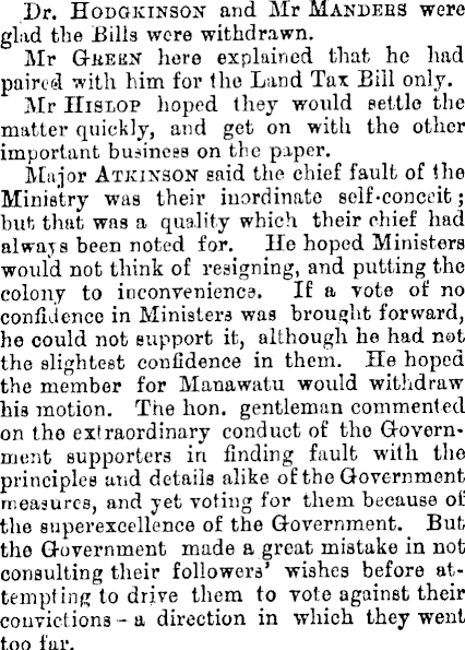 Dr. Hodgkinson and Mr Manders were glad the Bills wore withdrawn. Mr Green here explained that he had paired with him for the Land Tax Bill only. Mr Hislop hoped they would settle the matter quickly, and get on with the other important business on tbc paper. Major Atkinson said the chief fault of the Ministry was their inordinate self-conceit; but that was a quality which their chief had alwavs been noted for. He hoped Ministers would not think of resigning, and putting the colony to inconvenience. If a vote of no confidence in Ministers was brought forward, ho could not support it, although he had not tlie slightest confidence in them. He hoped the member for Mauawatu would withdraw his motion. The hon. gentleman commented on tho extraordinary conduct of the Government supporters in finding fault with the principles and details alike of tho Government measures, and yet voting for them because of tho superexcellence of the Government. But tho Government made a great mistake in not consulting their followers’ wishes before attempting to drive them to vote against their convictions - a direction in which they went too far.