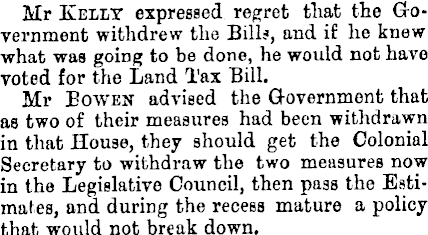 Mr Kelly expressed regret that the Government withdrew the Bills, and if he knew what was going to be done, he would not have voted for the Land Tax Bill. Mr Bowen advised the Government that as two of their measures had been withdrawn in that House, they should get the Colonial Secretary to withdraw the two measures now in the Legislative Council, then pass the Estimates, and during the recess mature a policy that would not break down.
