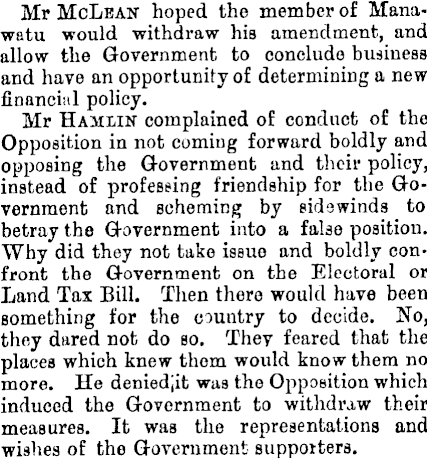 Mr McLean hoped the member of Manawatu would withdraw his amendment, and allow the Government to conclude business and have an opportunity of determining a new financial policy. Mr Hamlin complained of conduct of tho Opposition in not coming forward boldly and opposing the Government and their policy, instead of professing friendship for the Government and scheming by sidewinds to betray the Government into a false position. Why did they not take issue and boldly confront the Government on the Electoral or Land Tax Bill. Then there would have been something for the country to decide. No, they dared not do so. They feared that the places which knew them would know them no more. He denied|it was tho Opposition which induced the Government to withdraw their measures. It was the representations and wishes of tho Government supporters.